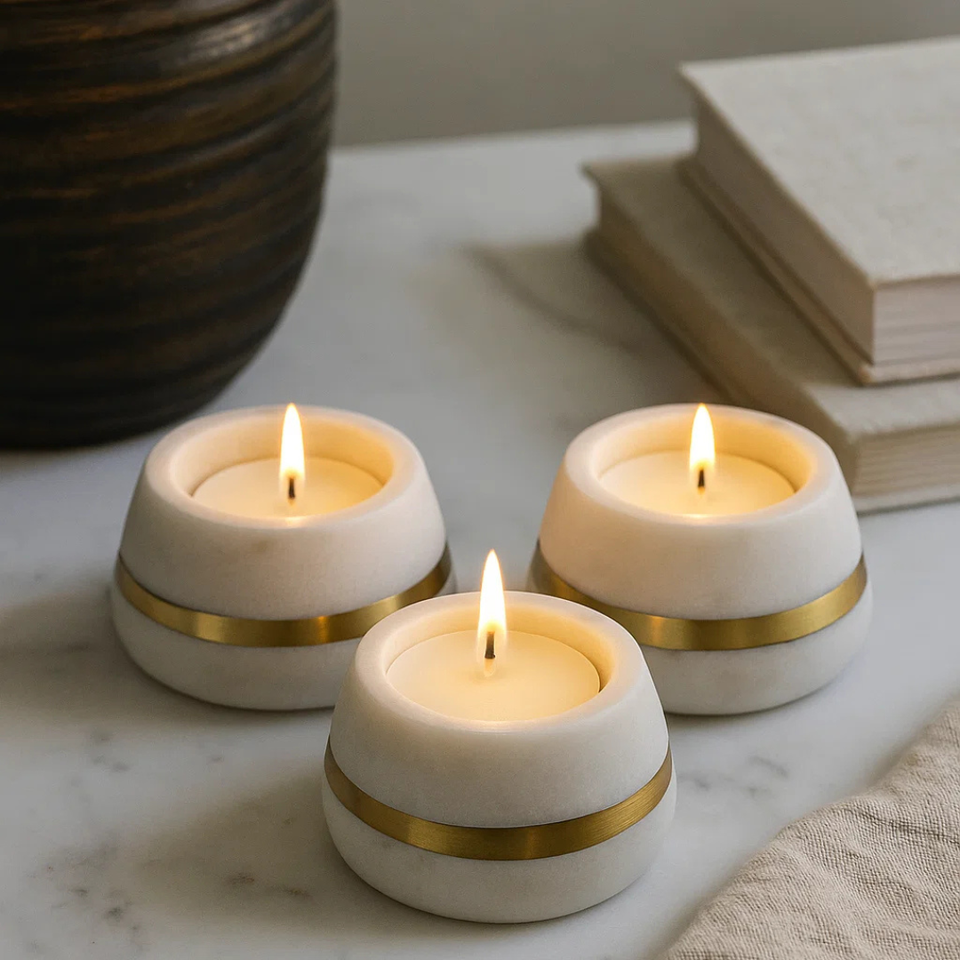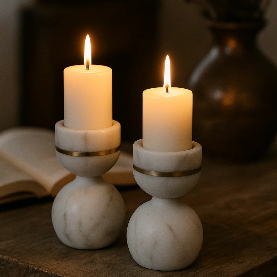 เชิงเทียนหินอ่อนสีขาวฝังทองเหลือง งานฝีมือสุดหรู สำหรับตกแต่งในเทศกาล ทำสมาธิ พิธีกรรม และเป็นของขวัญ