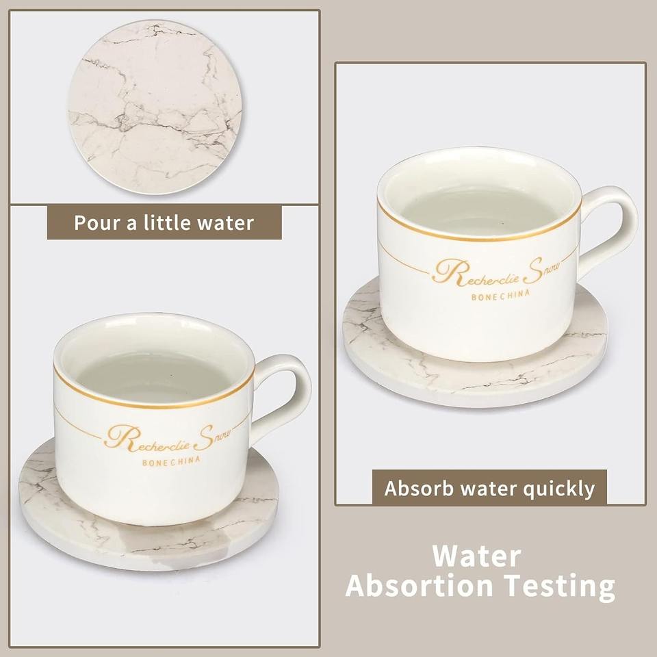ชุดจานรองแก้วหินอ่อนสีขาวพร้อมที่วาง จานรองแก้วดูดซับน้ำ จานรองแก้วเซรามิกน่ารัก สำหรับบาร์ โต๊ะอาหาร โต๊ะกาแฟ อุปกรณ์ตกแต่ง