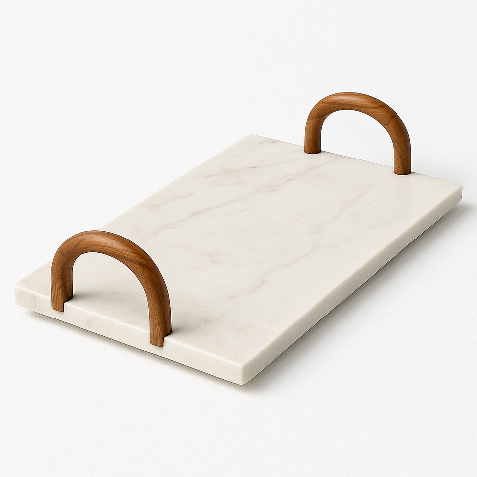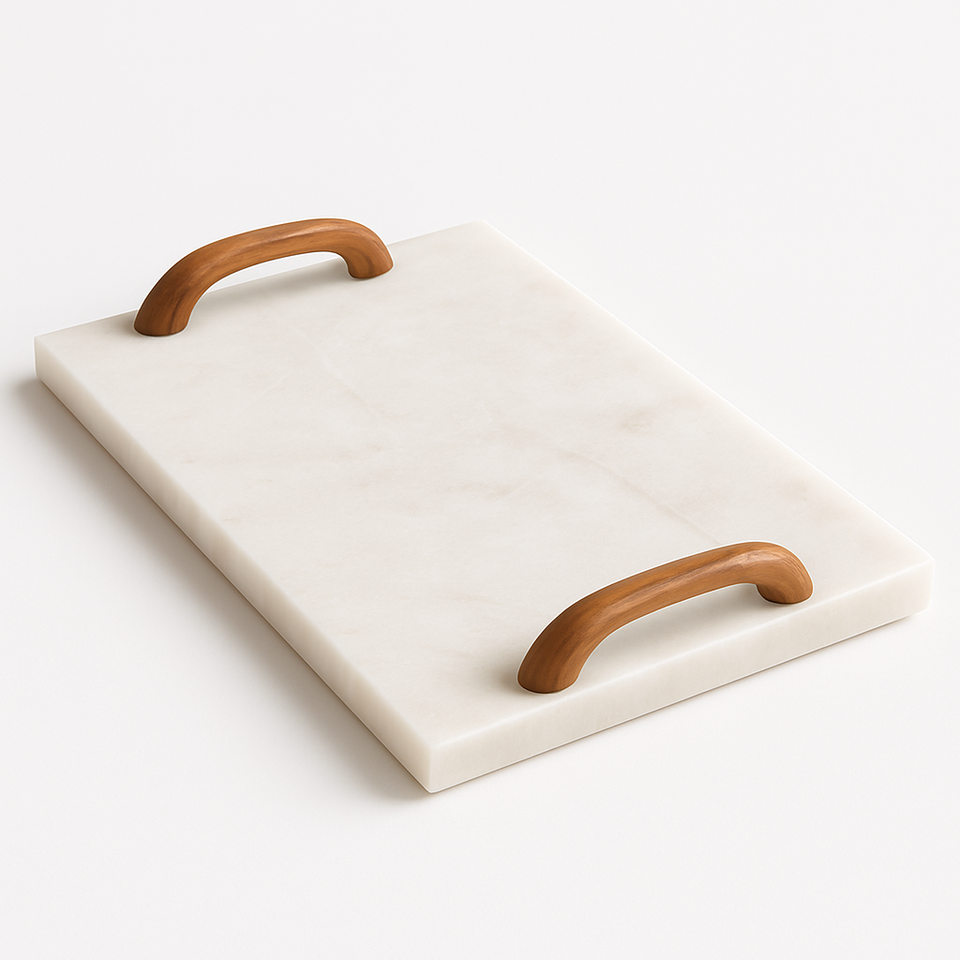 ถาดตกแต่งหินอ่อนสีขาวพร้อมด้ามจับโลหะสีขาวพื้นผิวเป็นเอกลักษณ์จัดเก็บทรงสี่เหลี่ยมผืนผ้าหรูหราสำหรับตกแต่งโต๊ะในห้องครัว