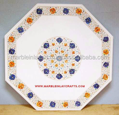 หินอ่อนสีขาวฝังโต๊ะรับประทานอาหารด้านบนแปดเหลี่ยมหินอ่อนฝังตารางด้านบน