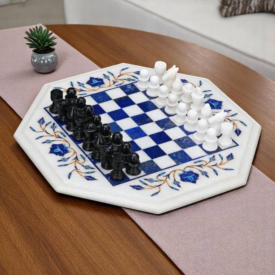 กระดานหมากรุกแปดเหลี่ยมหินอ่อนสีขาวฝังหินขัดเงาขนาด12 "รวม2ชิ้น