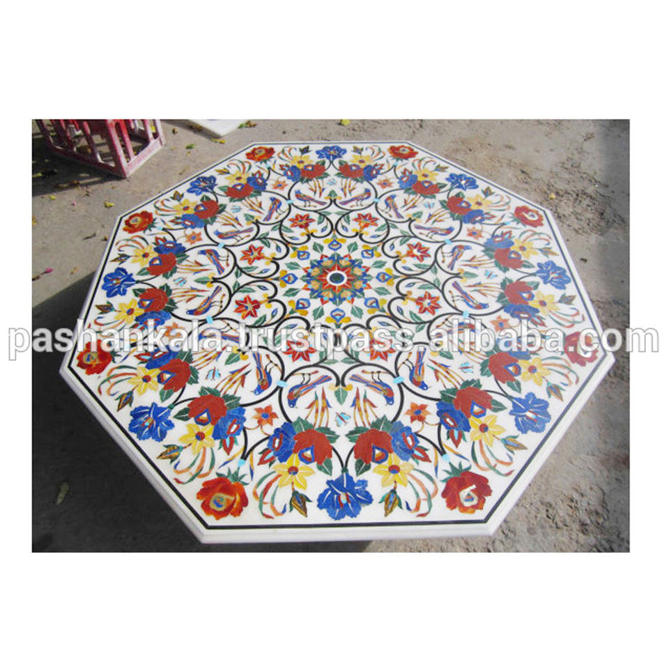 ท็อปโต๊ะอาหารหินอ่อนสีขาวทรงแปดเหลี่ยม ประดับด้วยหินหลากหลายชนิด
