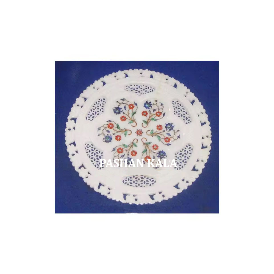จานหินอ่อนสีขาวสำหรับตกแต่งบ้านและสำนักงาน พร้อมลวดลายดอกไม้แกะสลักและฝังหินอ่อนสีขาวอเนกประสงค์ รูปทรงกลม