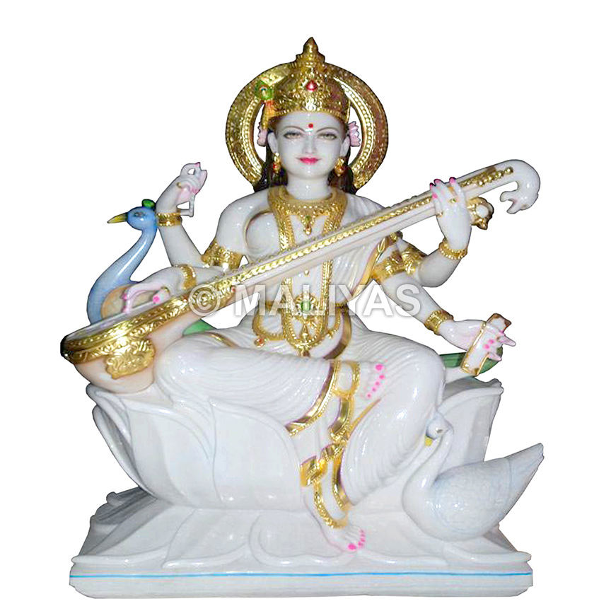รูปปั้นพระสราสวทีหินอ่อนสีขาว | พระพุทธรูปซาราสวาตีหินอ่อนทำมือสำหรับบ้านและวัด – มาลียาส