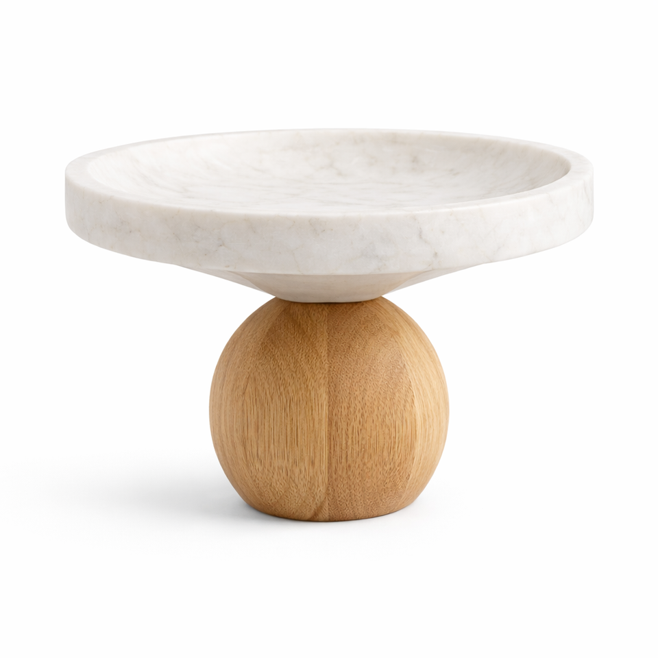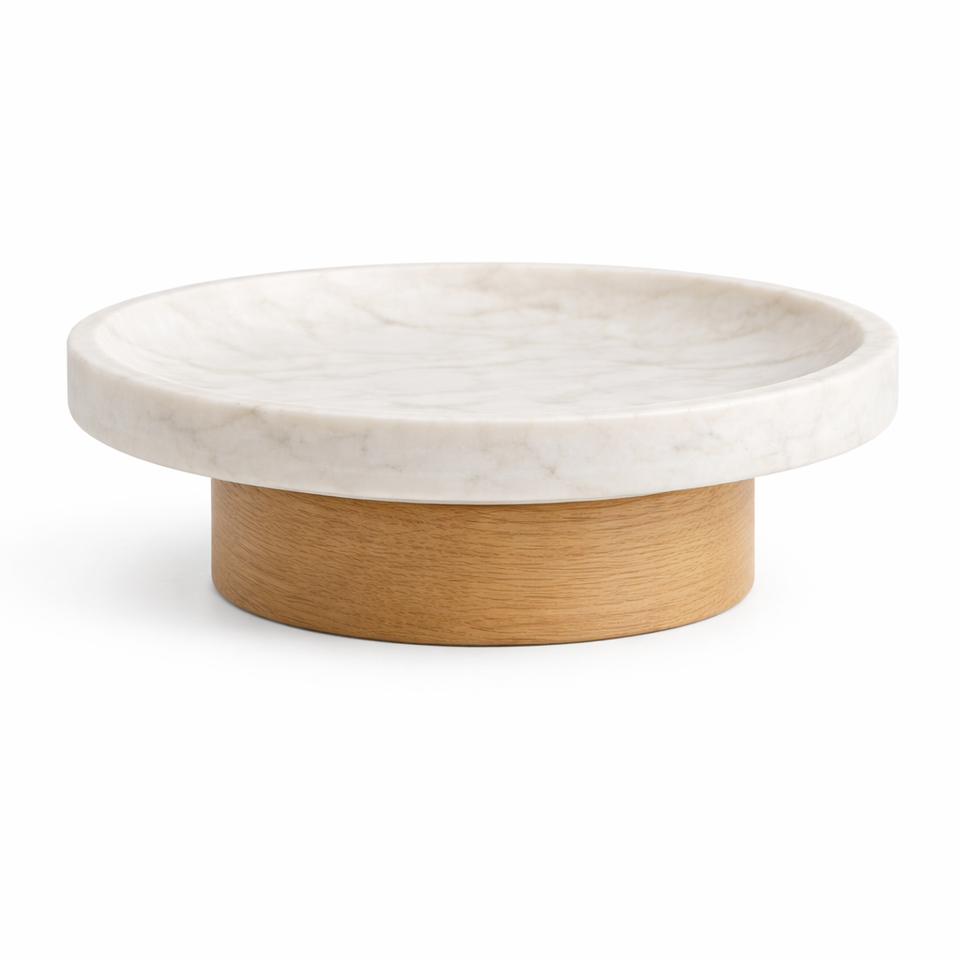 ถาดเสิร์ฟหินอ่อนสีขาวพร้อมฐานไม้สีดำทรงกลม ถาดวางโชว์บนโต๊ะยกสูงสำหรับรับประทานอาหารและการตกแต่งบ้านสไตล์หรูหรา