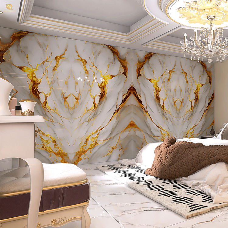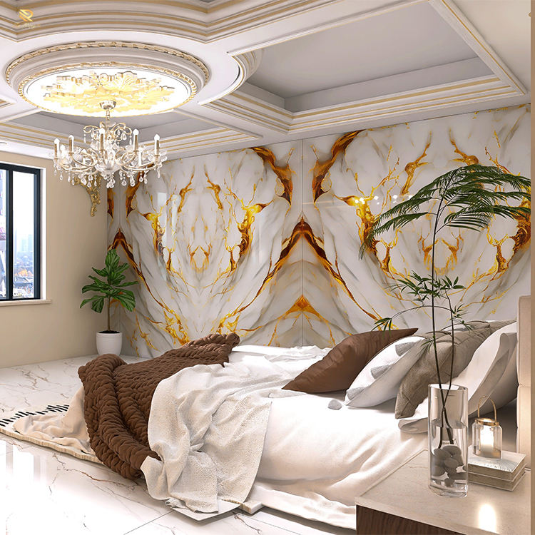 แผ่นหินอ่อนสีขาวแผ่นหนังสือสีทองเงางามแผ่นหินเผารูปแบบขนาดใหญ่การตกแต่งภายในผนังหรูหรากระเบื้องเคลือบเงา