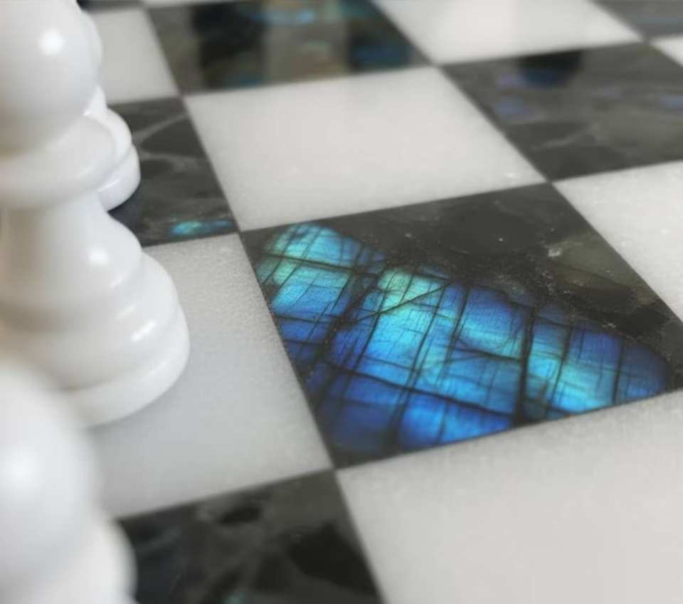 ชุดหมากรุกสำหรับทัวร์นาเมนต์หินอ่อนสีขาวทำด้วยมือพลอยลาบราดอไรต์ชิ้นหมากรุกมีสไตล์วินเทจชุดของขวัญสำหรับผู้ใหญ่