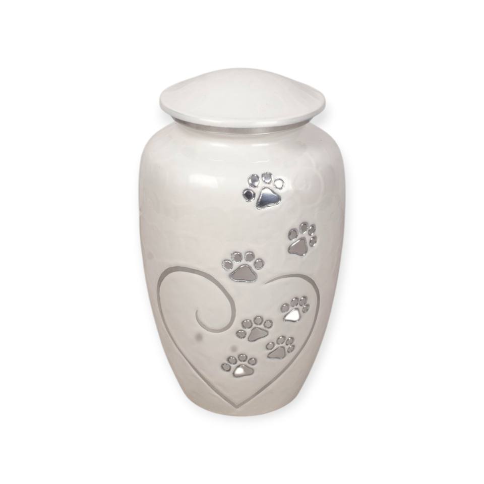 โกศโลหะสีขาวสำหรับสัตว์เลี้ยง พร้อมรอยเท้าสีเงินและลายหัวใจ สำหรับรำลึกถึงสุนัขและแมวที่รัก