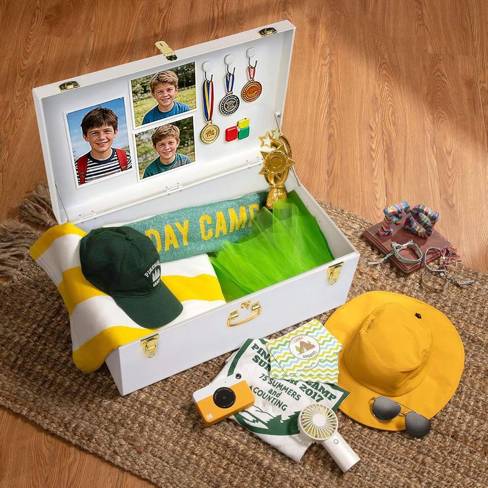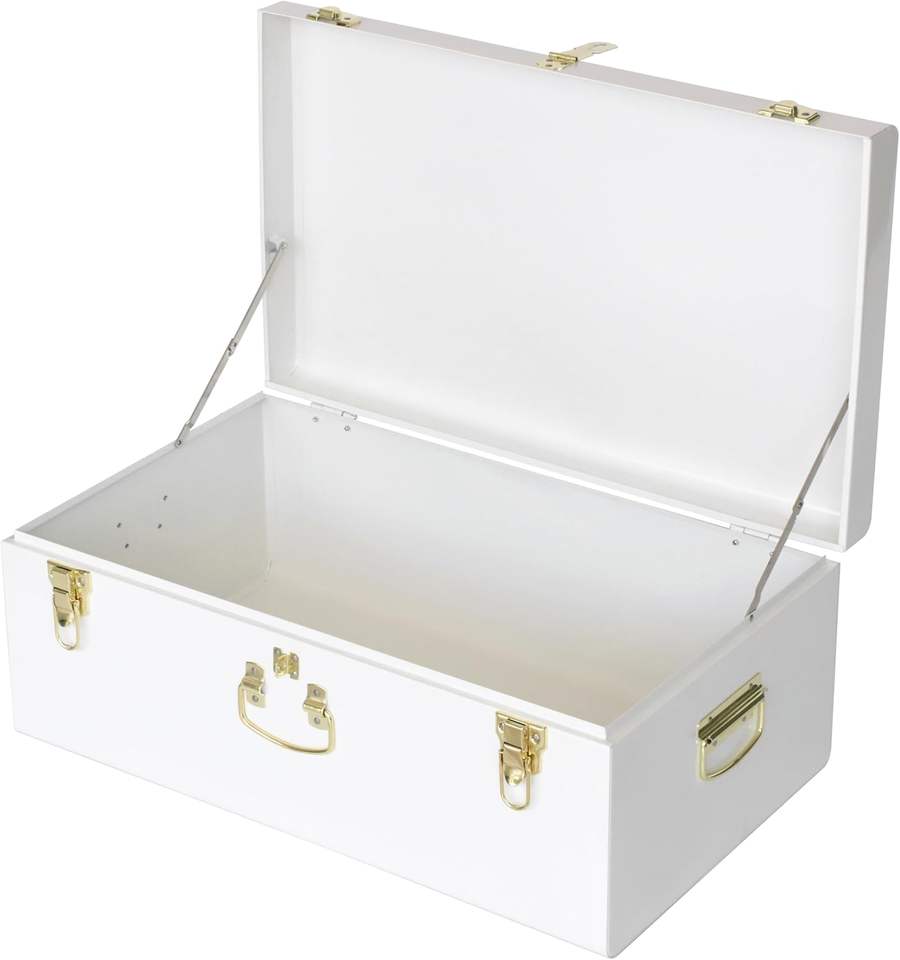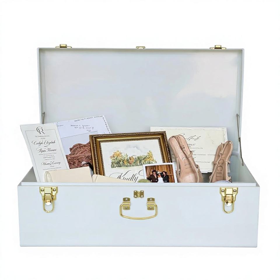 กล่องโลหะสีขาวสำหรับเก็บของที่ระลึกงานแต่งงาน พร้อมอุปกรณ์ตกแต่งสีทอง สำหรับเก็บการ์ดเชิญ รูปภาพ และของที่ระลึกวันแต่งงาน