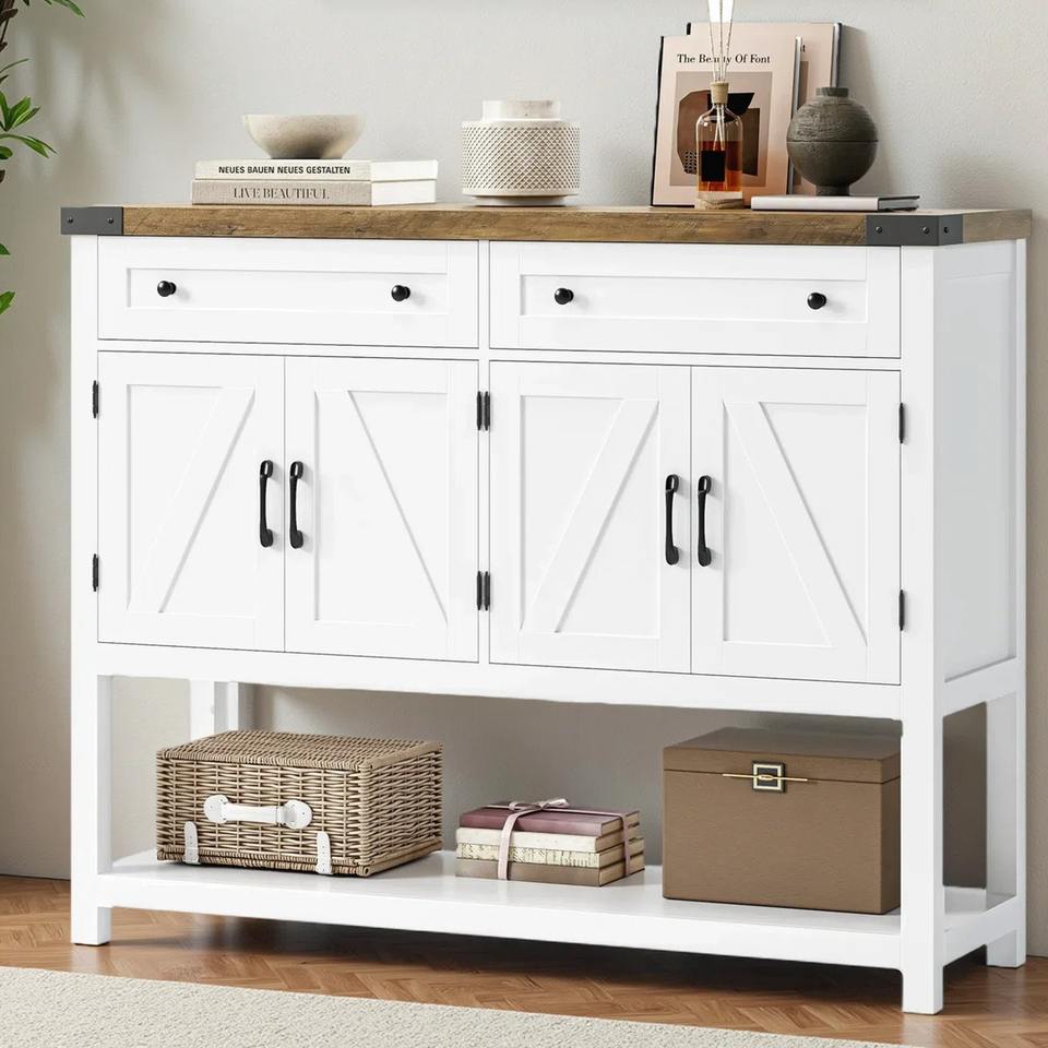 โต๊ะคอนโซลสีขาวแบบมีกระจกพร้อมตู้เก็บของและลิ้นชัก ตู้บุฟเฟต์สไตล์โมเดิร์นฟาร์มเฮาส์ ตู้ข้างทางเข้า เฟอร์นิเจอร์โรงแรม