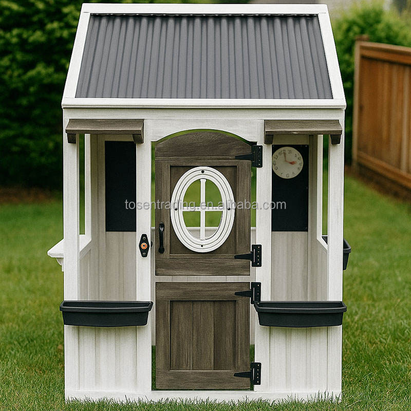 บ้านเด็กเล่นไม้กลางแจ้งสีขาวทันสมัย พร้อมอ่างล้างหน้า เตา หน้าต่าง ห้องครัวพร้อมหม้อและกระทะและอุปกรณ์ครัว