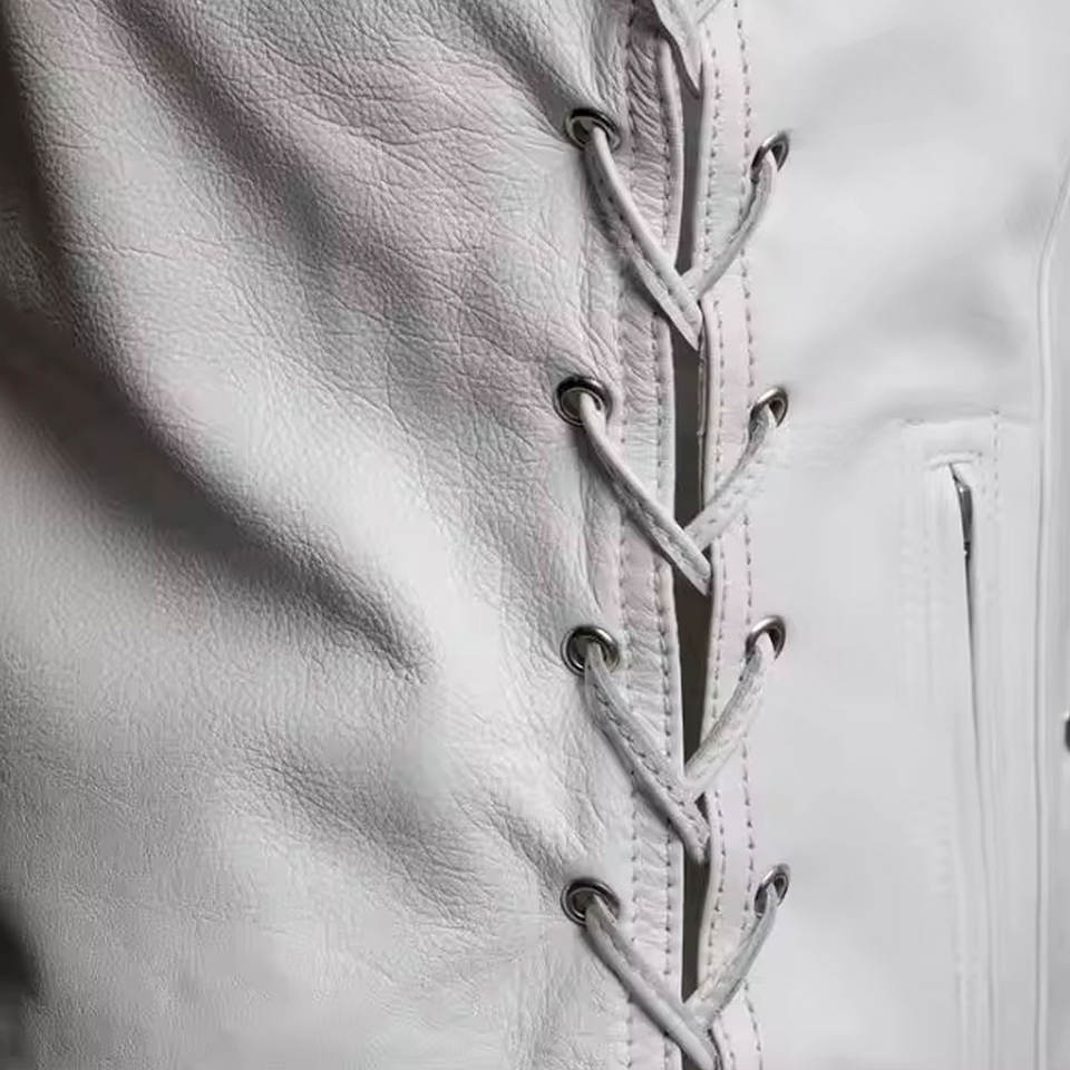 เสื้อกั๊กหนังแท้ผ้าแคนวาสสีขาวสำหรับขี่มอเตอร์ไซค์ หนังวัวคุณภาพพรีเมียม กระดุมแป๊กสี่เม็ด ปรับสายรัดด้านข้างได้ ซ่อนกระดุมอย่างแน่นหนา เหมาะสำหรับฤดูใบไม้ร่วง