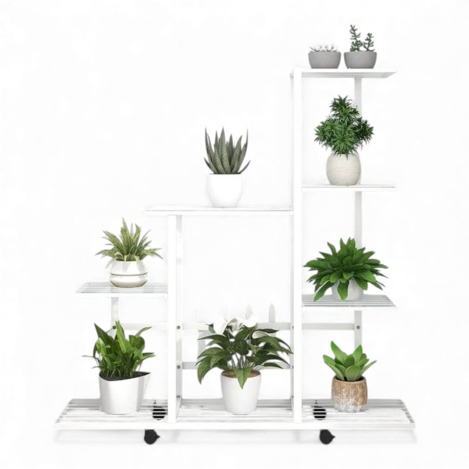 ชั้นวางต้นไม้แบบมีล้อหลายชั้นสีขาว พร้อมชั้นวางเก็บของ สำหรับตกแต่งบ้านและสำนักงานภายในอาคาร