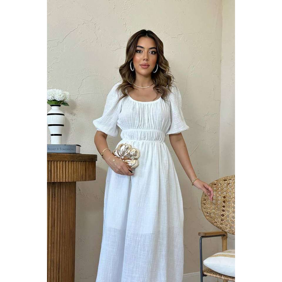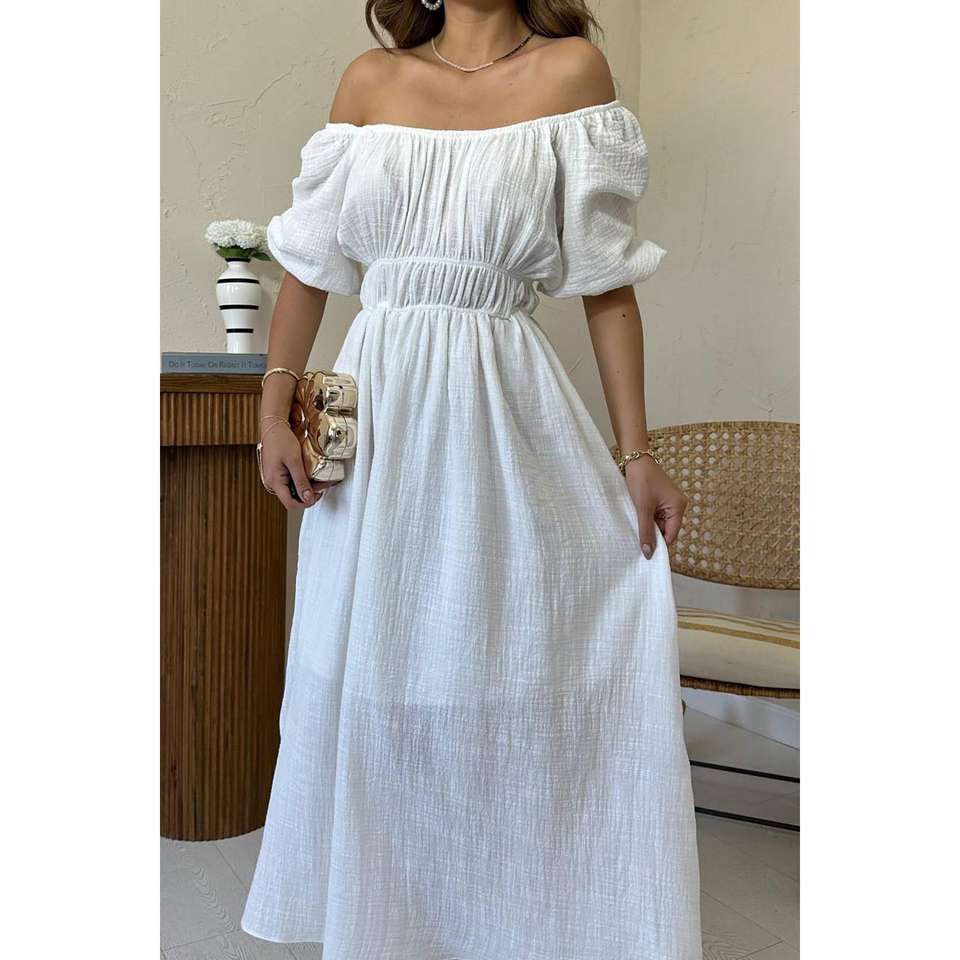 เดรสผ้าลินินสีขาวแบบเปิดไหล่ เอวยางยืด ทรงหลวม ระบายอากาศได้ดี สวมใส่สบายทุกวัน ผ้าทอ สไตล์เรียบง่าย