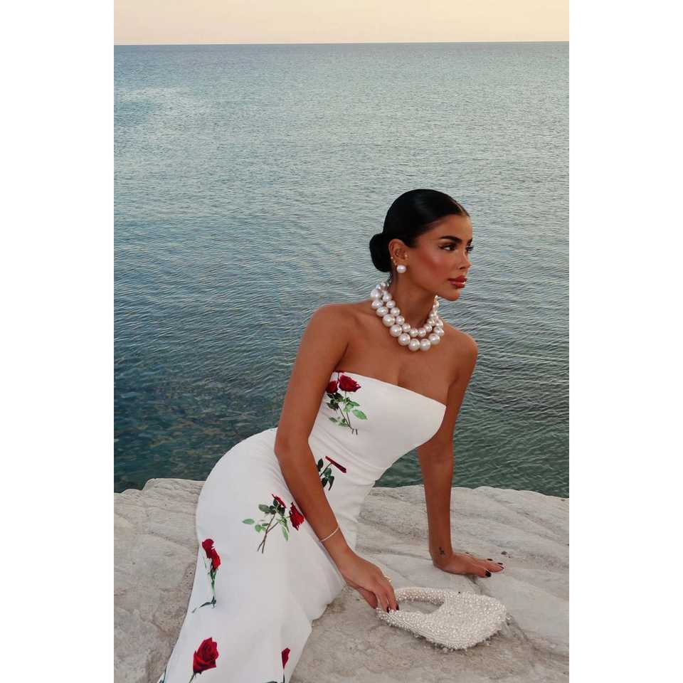 ชุดราตรีสีขาวสำหรับผู้หญิง ลายดอกกุหลาบ ทรงเอ็มไพร์ แต่งดอกไม้ สำหรับงานเลี้ยงตอนเย็น งานพิธีการ มีไซส์ XS ความยาวระดับเข่า
