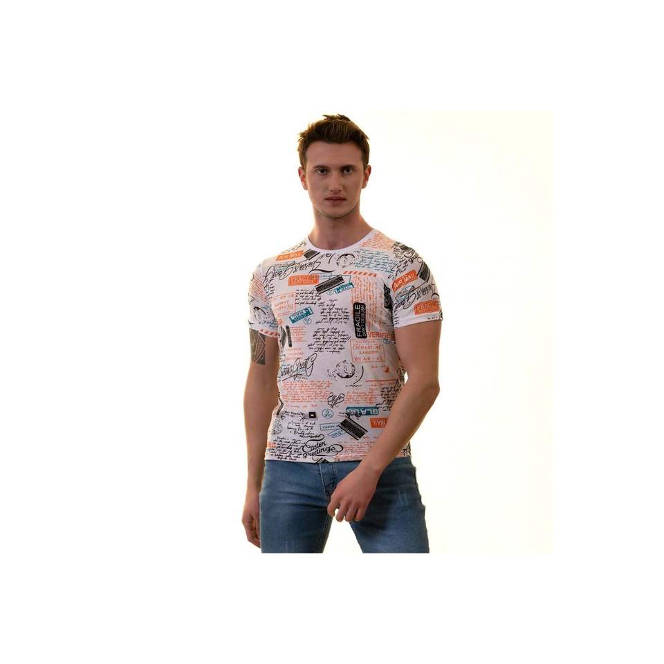 เสื้อยืดคอกลมสำหรับผู้ชายเสื้อยืดคอตตอนคอมบ์สีขาวสีส้มดำแนวการเดินทางรอบโลก