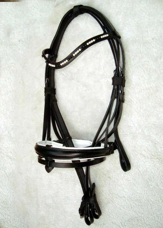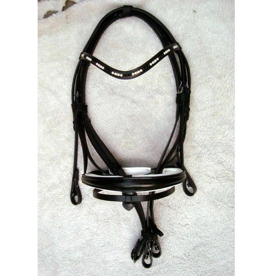 บังเหียนม้าหนังแท้สีดำทำมือ พร้อมสายคาดศีรษะประดับมุก บุด้วยวัสดุเพื่อความสบาย เหมาะสำหรับกีฬาขี่ม้าแบบตะวันตก แข่งม้า พร้อมอุปกรณ์เสริมอื่นๆ เช่น สายรัดเอว และอานม้า