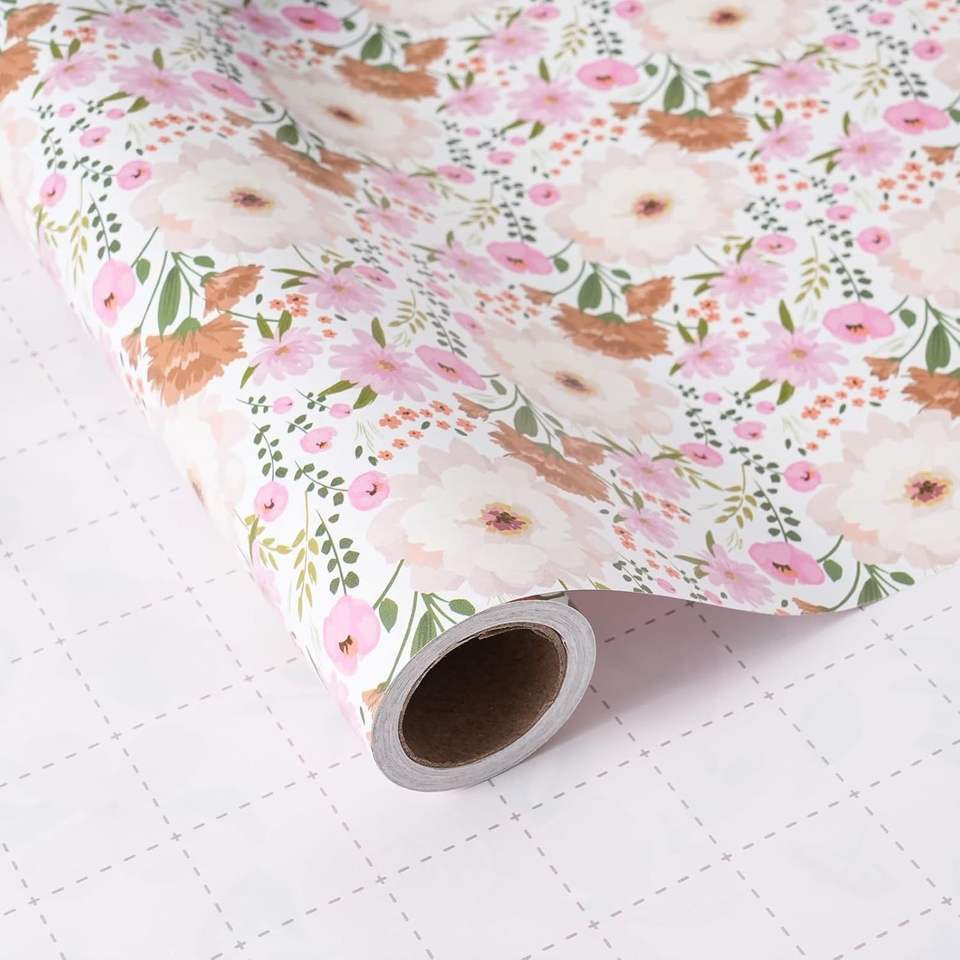 กระดาษห่อลายดอกไม้สีขาวชมพู ม้วนขนาด 17x16.5 ฟุต ลายดอกโบตั๋นและดอกเดซี่ สำหรับงานแต่งงาน งานเลี้ยงฉลองสมรส งานวันเกิด