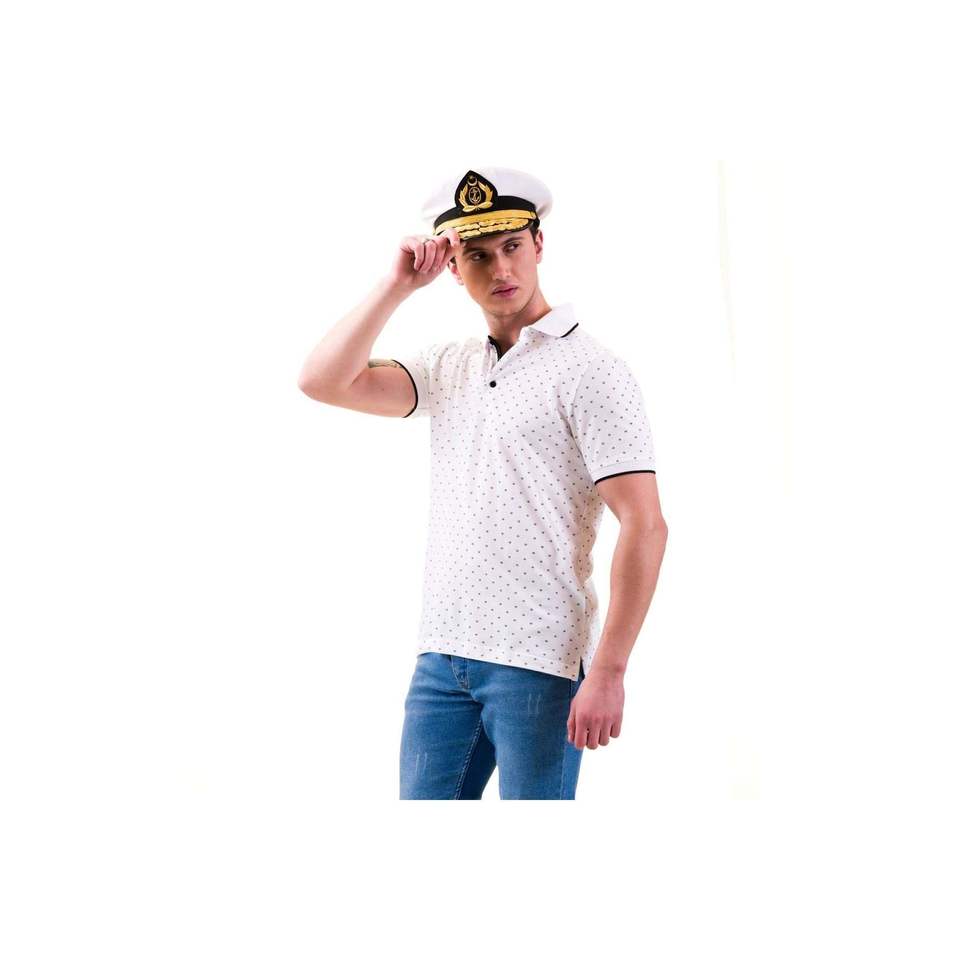 เสื้อยืดแขนสั้นคอโปโลสีขาวทรงสลิมฟิตผ้าฝ้ายลายเรขาคณิต