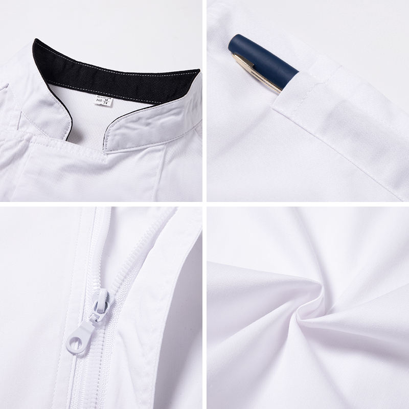 เสื้อเชฟร้านอาหารแขนสั้นผ้าโพลีเอสเตอร์สีขาวมีซิปกันลื่นชุดเครื่องแบบโรงแรมสำหรับทำอาหาร