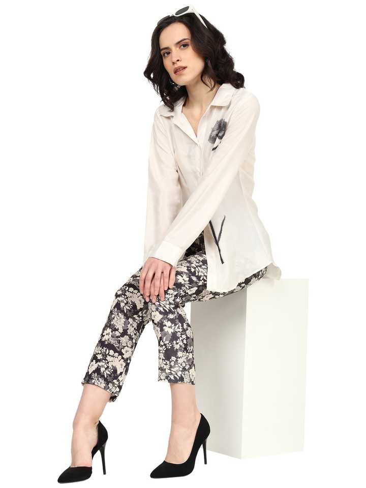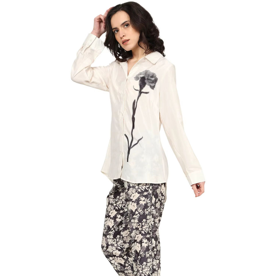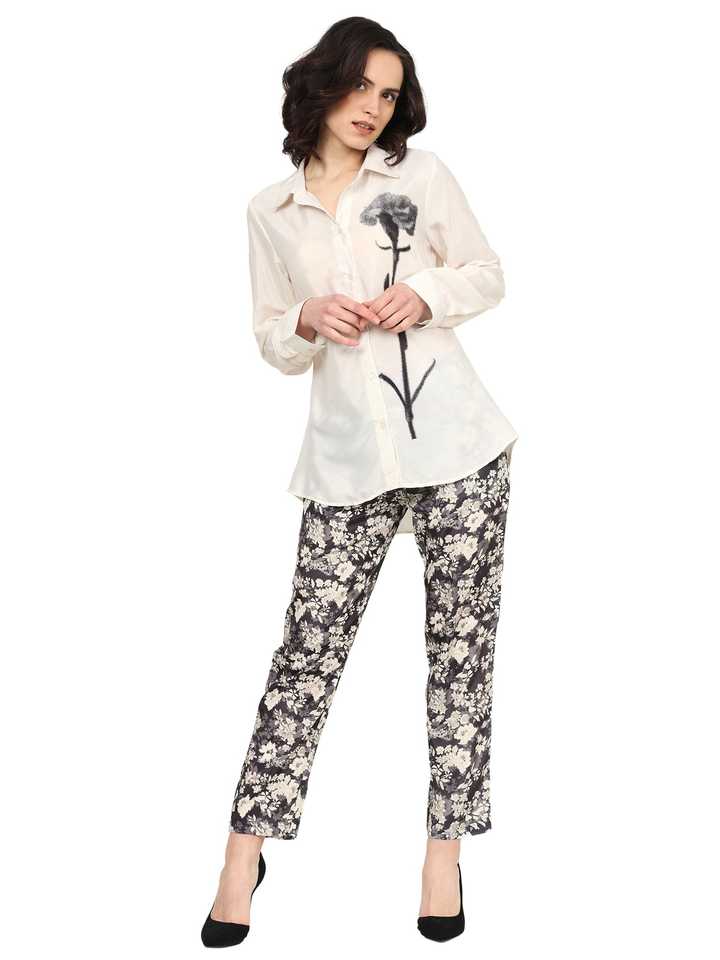 ชุดเซ็ตผ้าโพลีเอสเตอร์สีขาวลายดอกไม้ปักลายพิมพ์ทันสมัยสำหรับผู้หญิง ชุดเข้าชุดสวมใส่สบายๆ สไตล์ลำลองแฟชั่นสองชิ้น