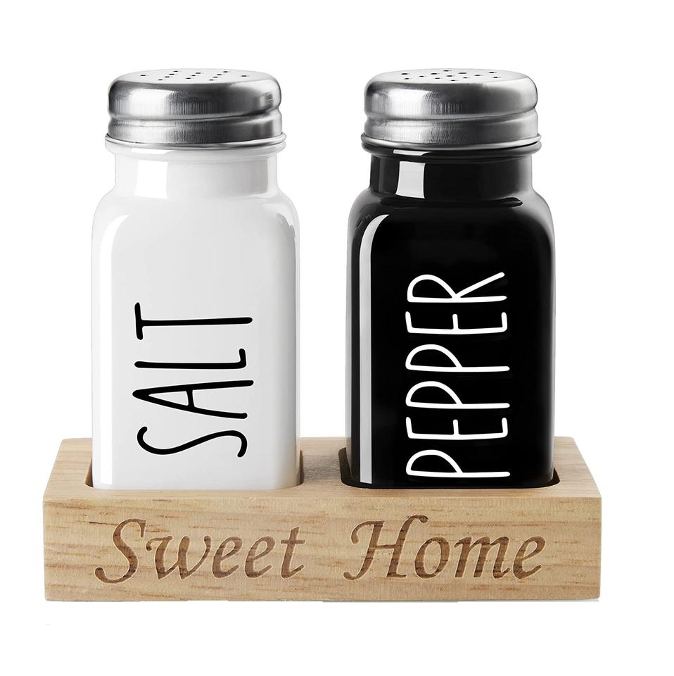 แคดดี้เกลือและพริกไทยเคลือบผงสีขาวแคดดี้แฮนด์เมดทำด้วยมือแคดดี้รูปร่างแบบกำหนดเองที่วางบนโต๊ะโลหะและพริกไทย