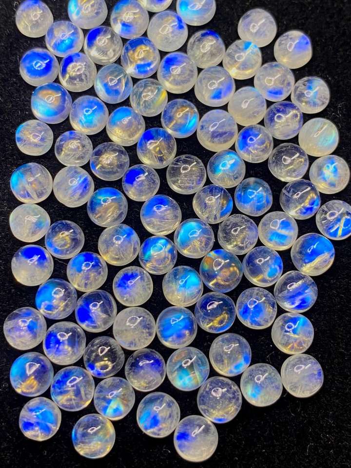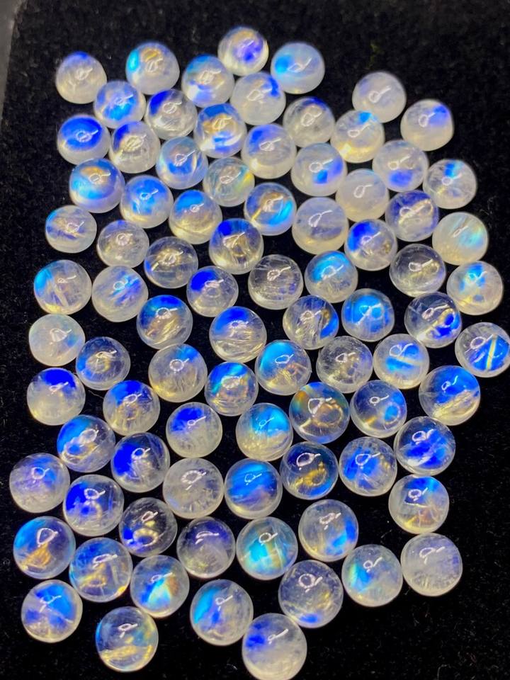 พลอยมูนสโตนสีขาวรุ้ง ทรงคาโบชอง ประกายไฟสีน้ำเงิน ขนาด 4 มม. ถึง 10 มม. สำหรับทำเครื่องประดับ