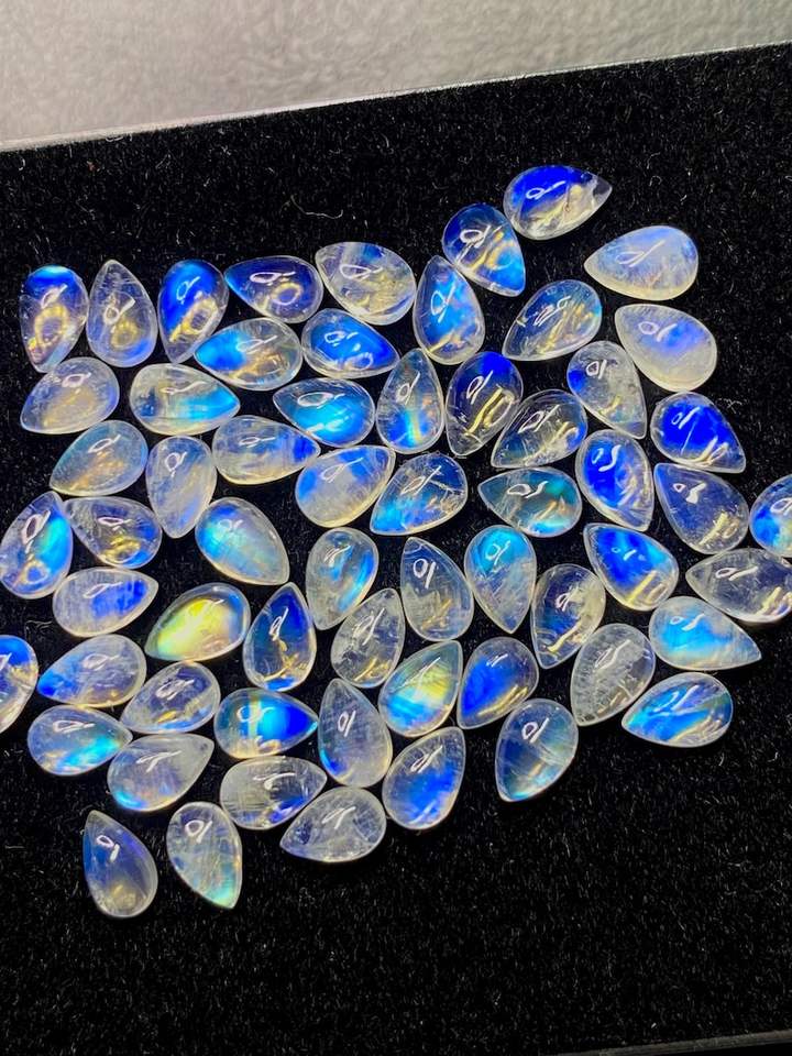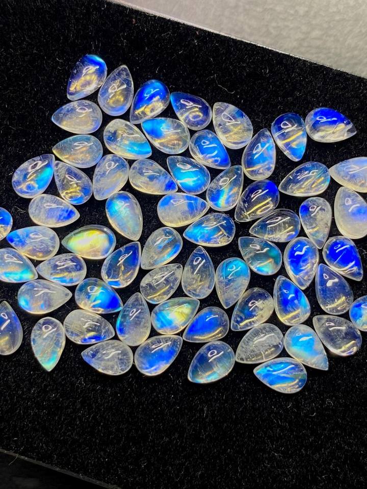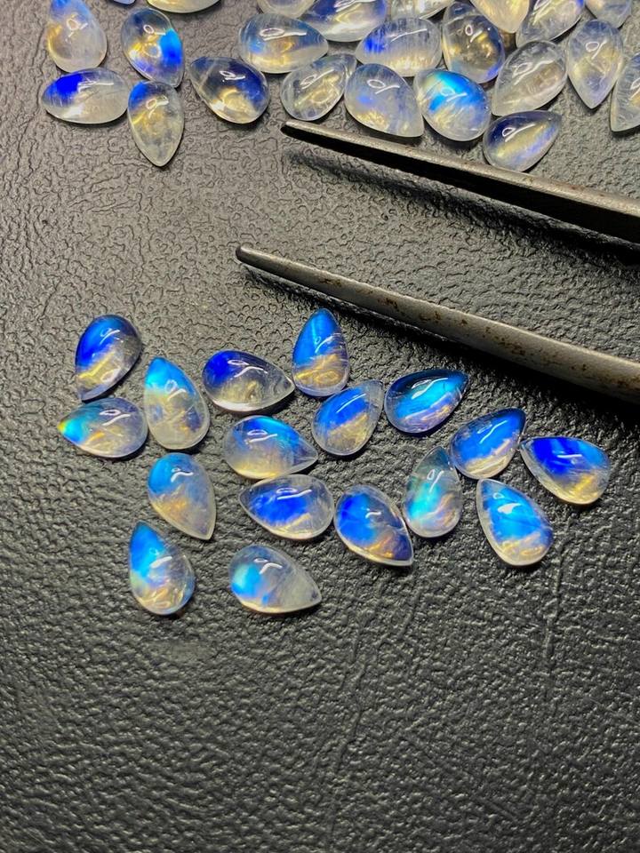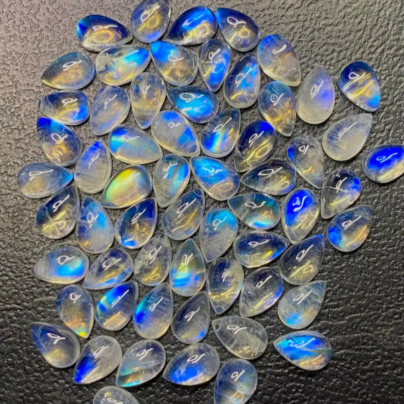 มูนสโตนสีขาวรุ้งทรงลูกแพร์แบบคาโบชอง พร้อมแสงสีฟ้า ขนาด 6x4 มม. ถึง 8x10 มม. สำหรับทำเครื่องประดับ