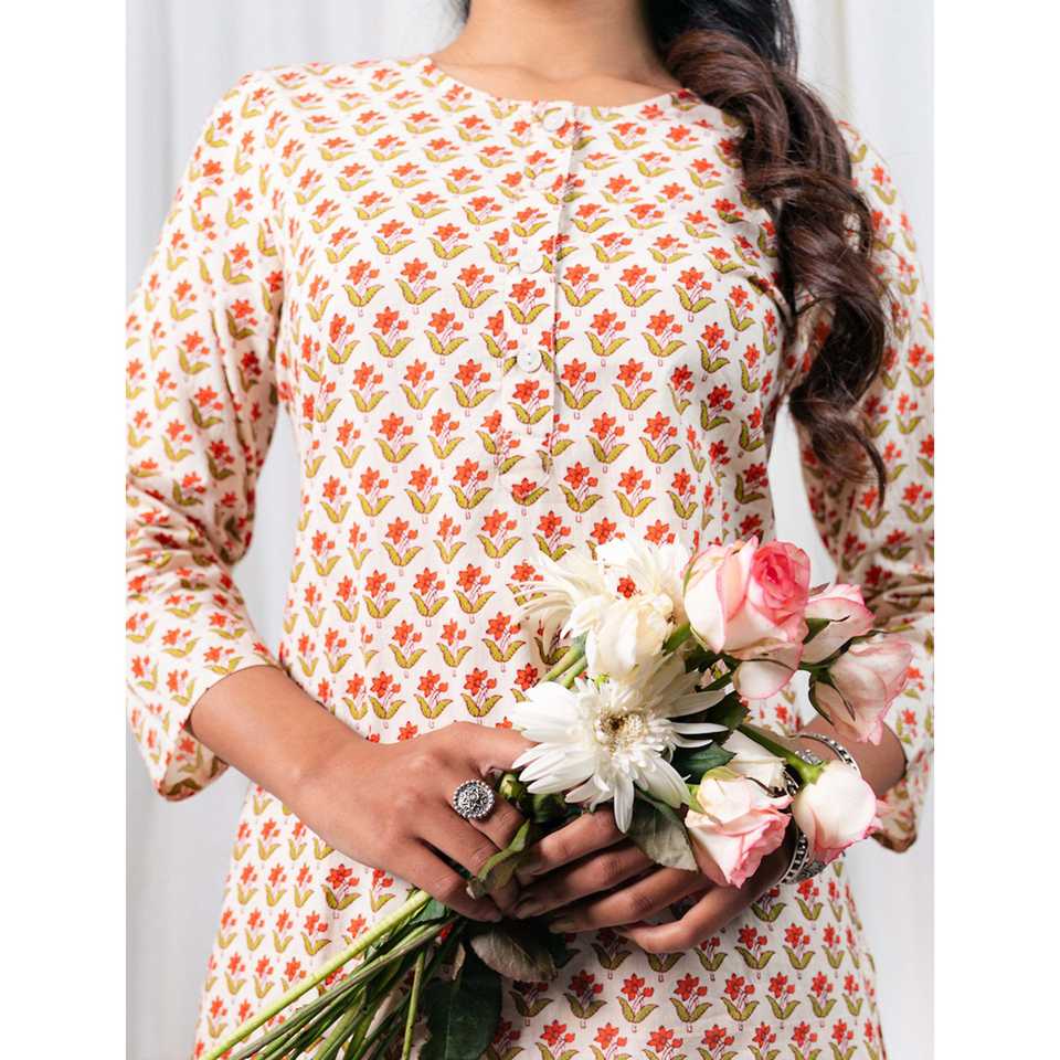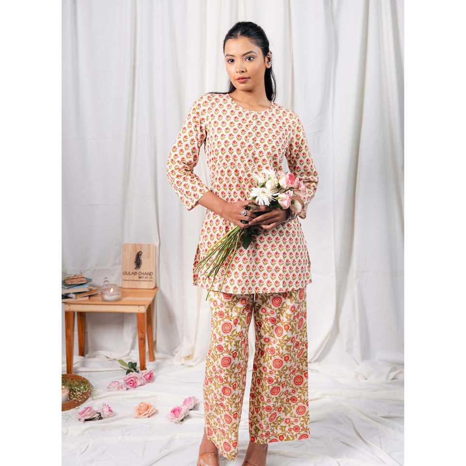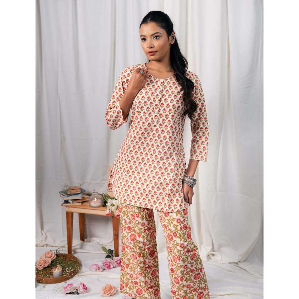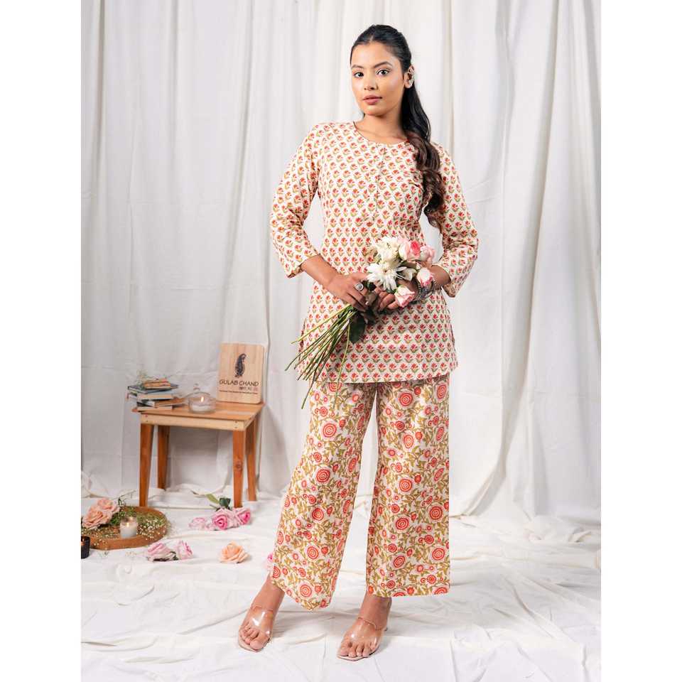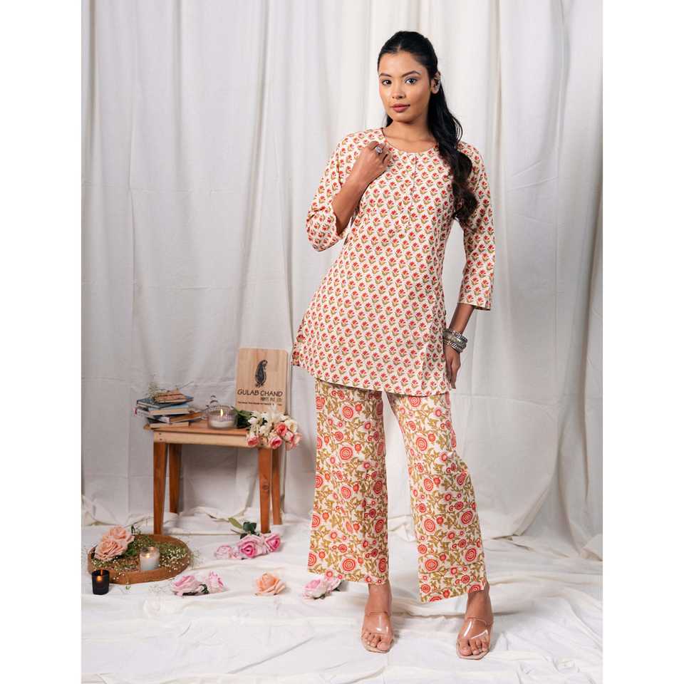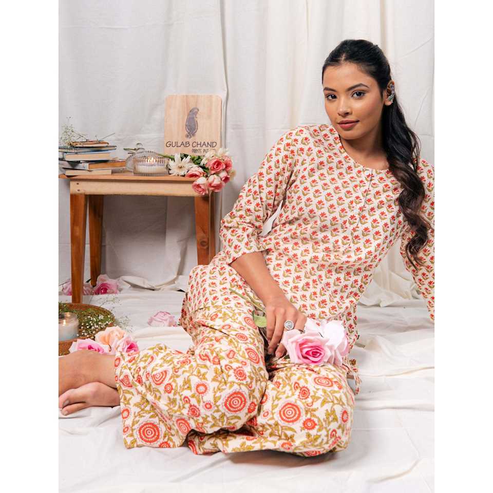 ชุดเซ็ตผ้าฝ้ายพิมพ์ลายบล็อกสีขาวแดง แขนสามส่วน