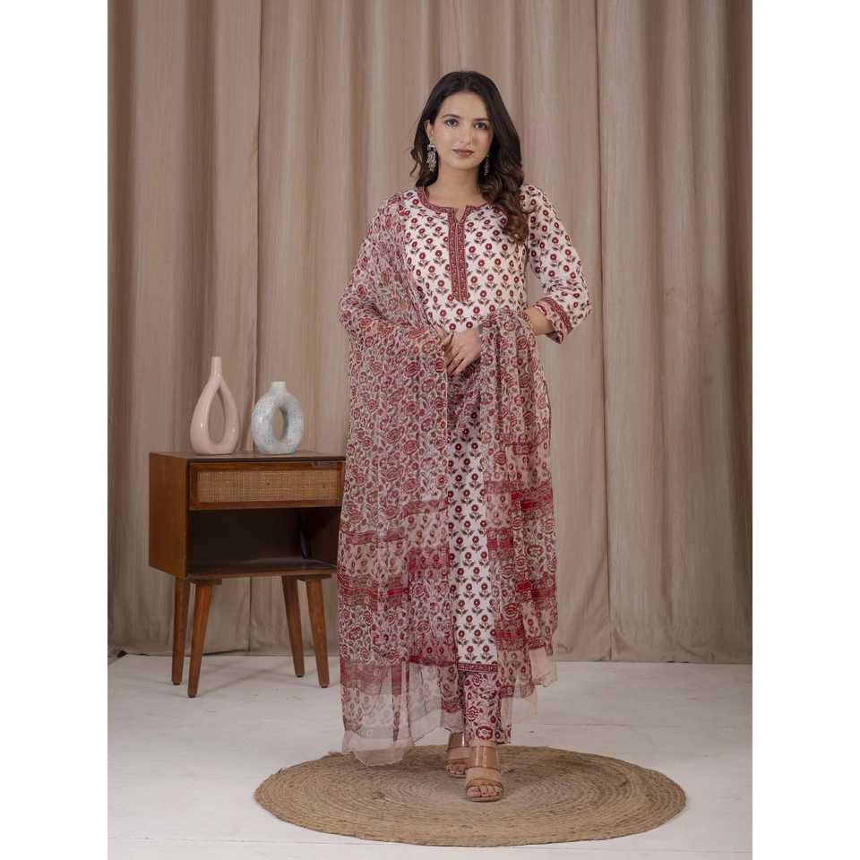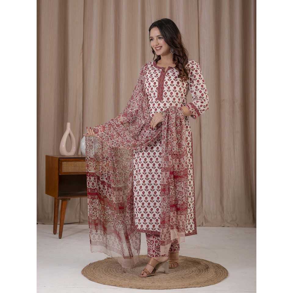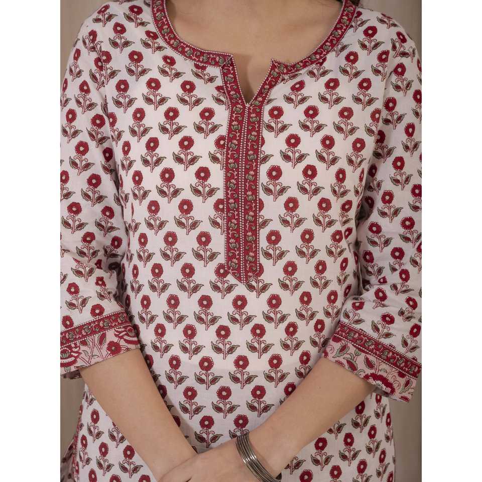 ชุดคุรตะผ้าฝ้ายพิมพ์ลายมือสีขาวแดง แขนสามส่วน สำหรับใส่ในชีวิตประจำวัน