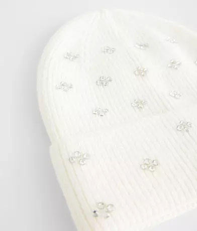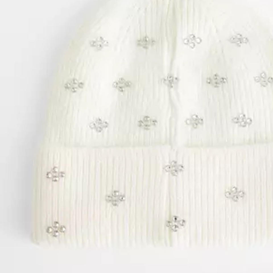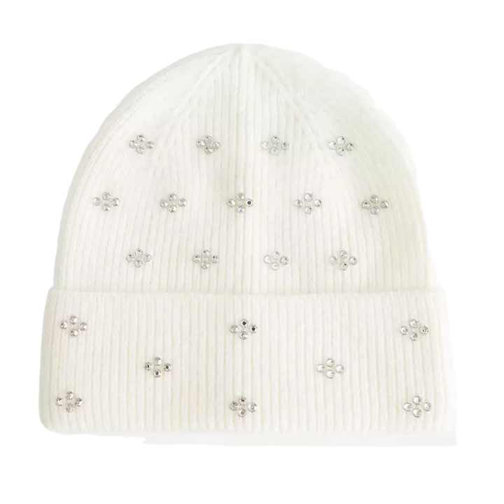หมวกบีนนี่ถักลายแจ็คการ์ดประดับมุกและคริสตัลสีขาว แบบยืดได้ ใส่ได้ทั้งชายและหญิง เหมาะสำหรับฤดูหนาว ผลิตจากอะคริลิก ขายส่งจากโรงงาน