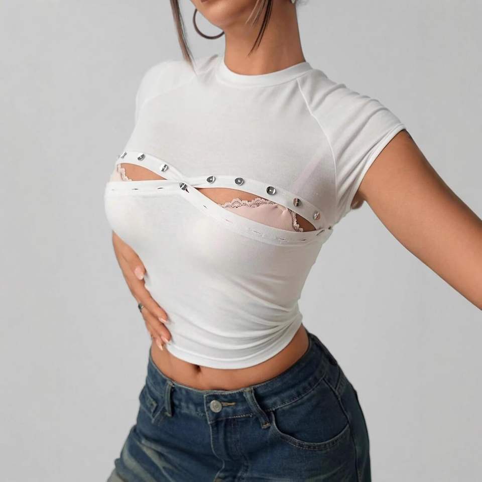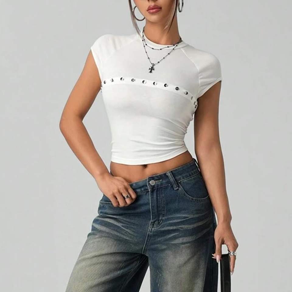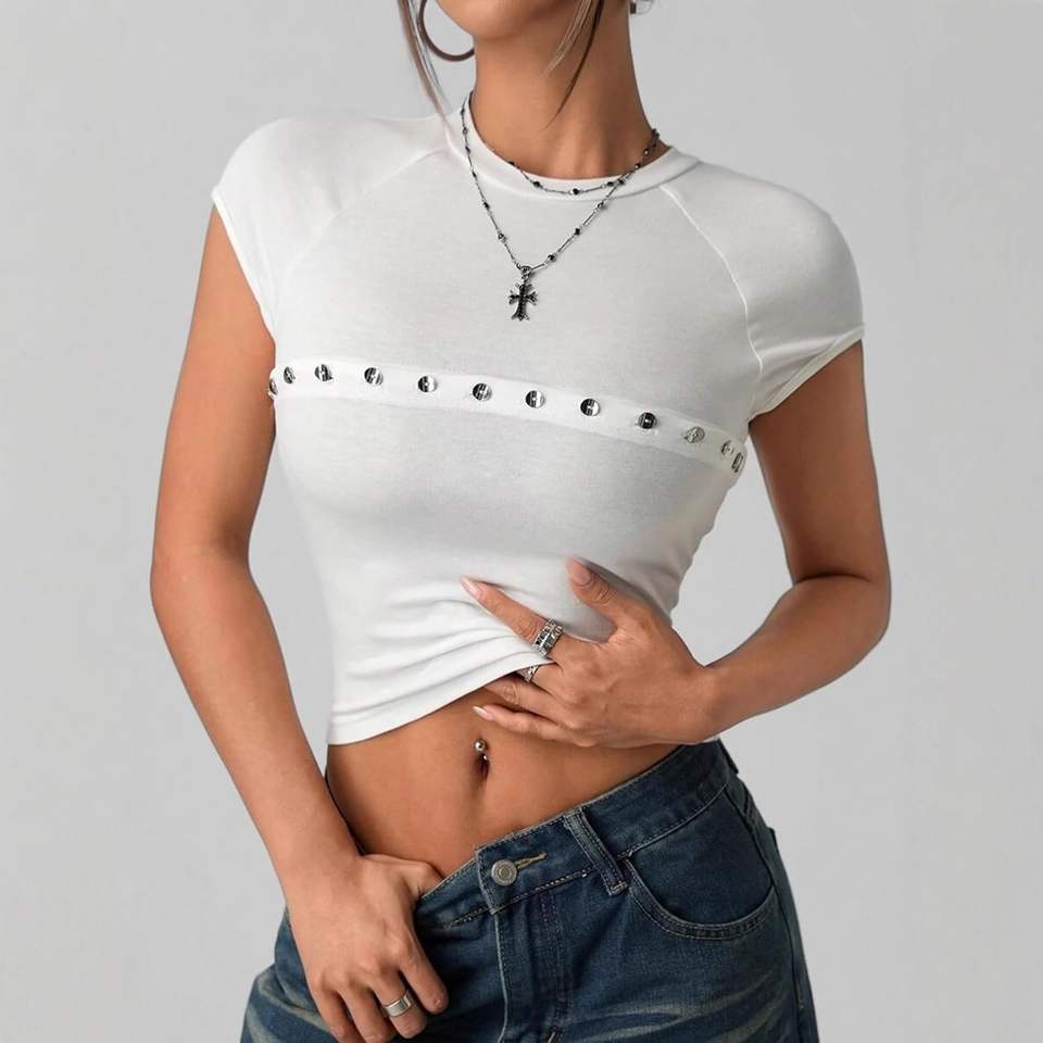 เสื้อครอปแขนสั้นสีขาวสำหรับผู้หญิง สไตล์สตรีทแวร์ ทรงปกติ ผ้าถักโพลีเอสเตอร์ สีพื้น คอกลม แต่งกระดุม ย้อมสีเรียบ