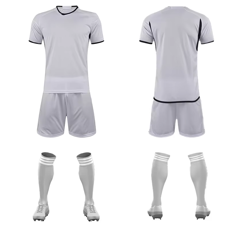 ชุดฟุตบอลสีขาว - เสื้อคอกลมแบบปรับแต่งได้ กางเกงขาสั้นขอบสีดำ - สำหรับผู้ใหญ่ ระบายอากาศได้ดี แห้งเร็ว ผลิตจากโพลีเอสเตอร์ 100% ชุดฝึกซ้อม