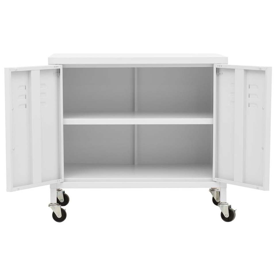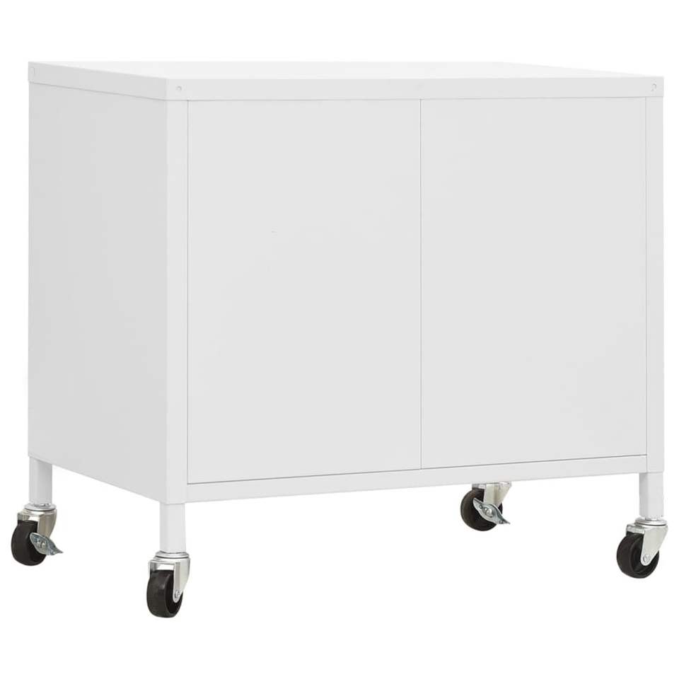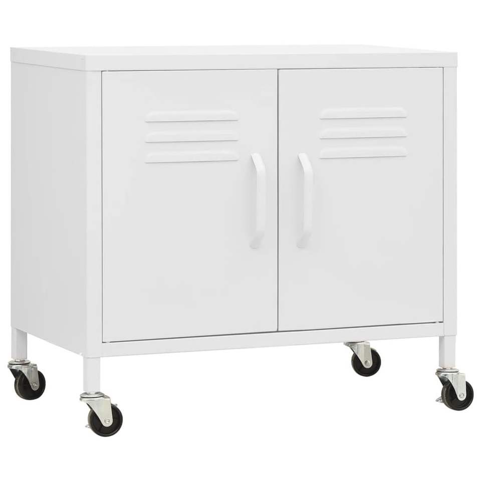 ตู้เก็บของเหล็กสีขาวขนาดกลางพร้อมล้อเลื่อนแบบล็อคได้สำหรับใช้ในห้องนั่งเล่น
