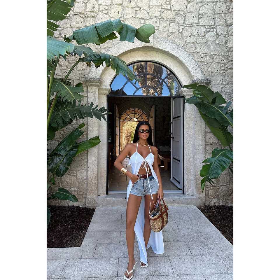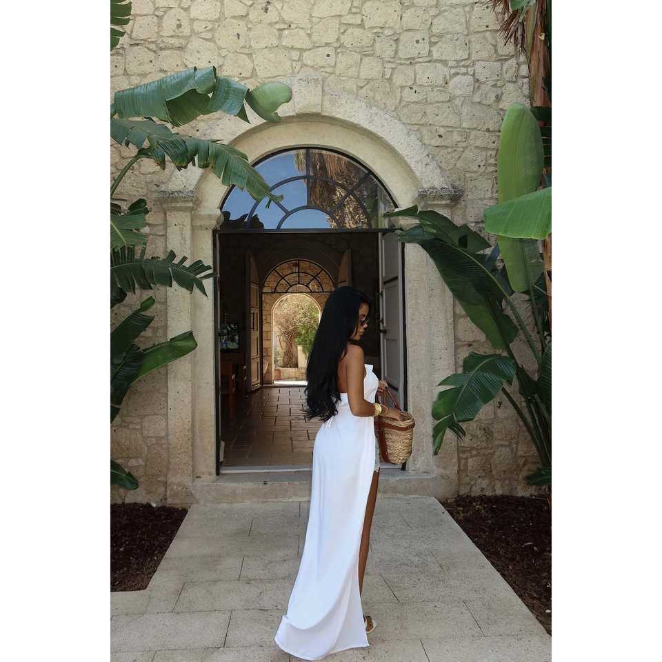 ชุดเดรสชายหาดสีขาวแบบผูกเชือกไร้สาย