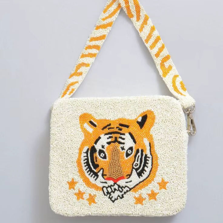 กระเป๋าสะพายข้างปักลายเสือขาวประดับลูกปัดพร้อมสายสะพายลายเสือ กระเป๋าสะพายไหล่ทรงสี่เหลี่ยมเล็กสำหรับผู้หญิงลายสัตว์