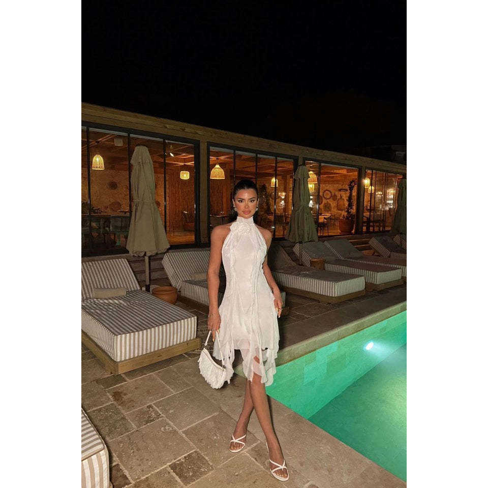 เดรสสั้นผ้าทูลสีขาว แต่งซิปและระบาย ไซส์ XL ไซส์พลัส สไตล์เรียบร้อย สายเดี่ยว คอปก ไม่มีปก ลายเรียบ