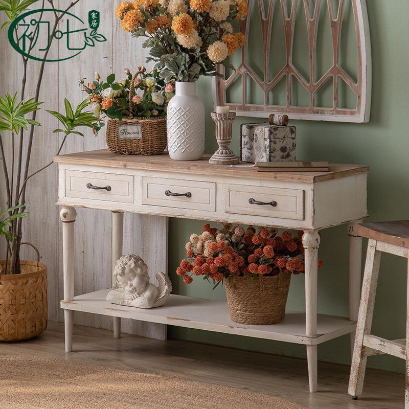 โต๊ะคอนโซลวินเทจสีขาว สไตล์โบราณ หน้าไม้ ชั้นวางของ โต๊ะทางเข้าบ้าน ตกแต่งสไตล์อเมริกันคันทรี่ A2689 สำหรับผู้ใหญ่