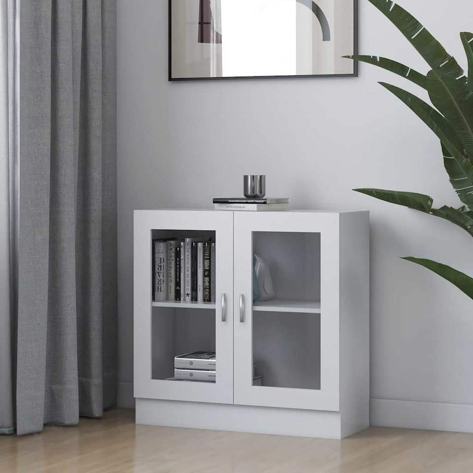 ตู้โชว์สีขาวขนาดกลาง วัสดุไม้แปรรูป สำหรับห้องนั่งเล่น