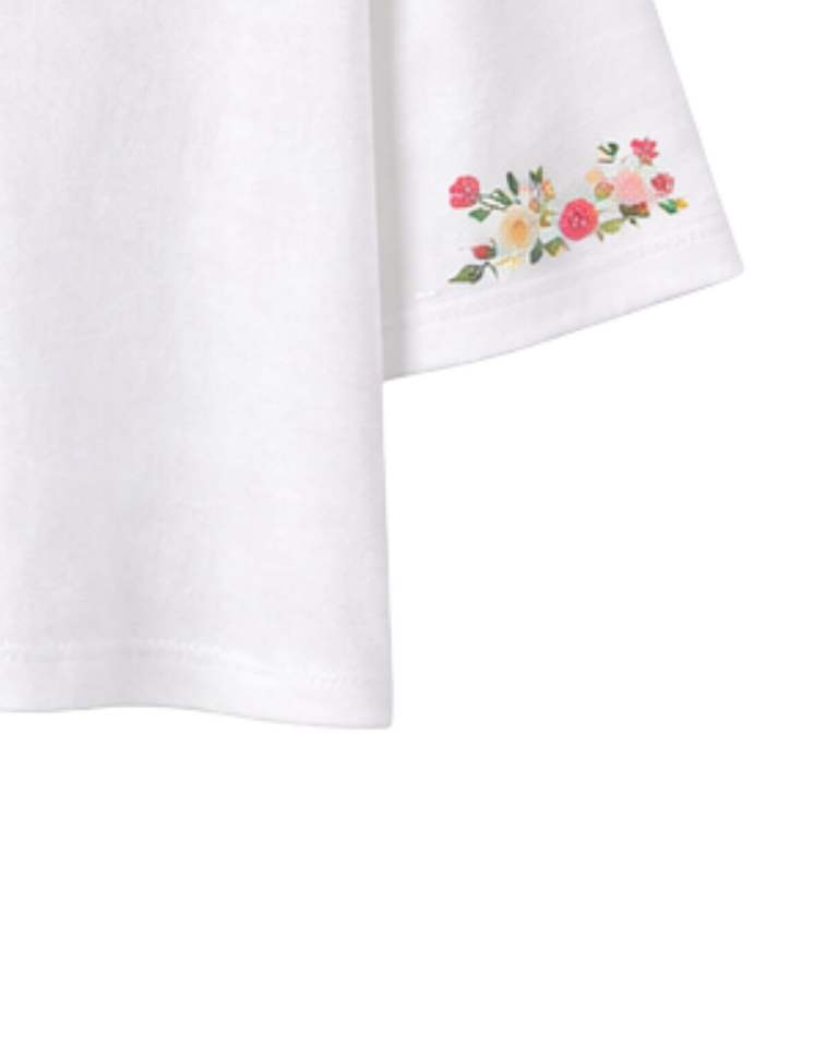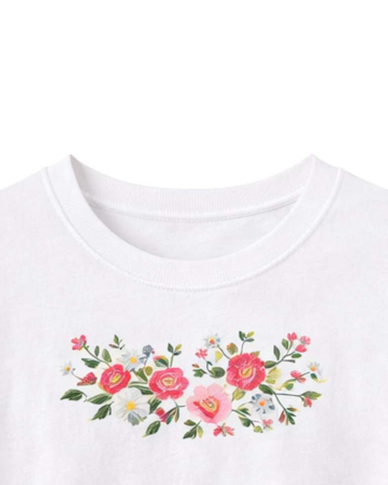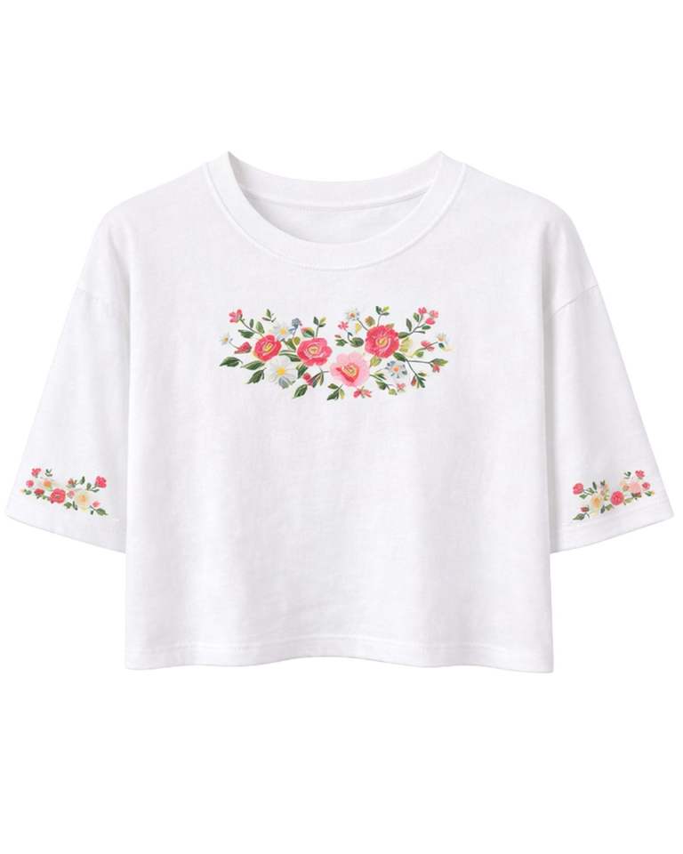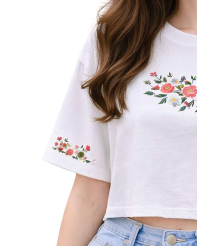 White Women Crop T Shirt Floral Embroidery Short Sleeve Casual Fashion Cotton Blend Soft Summer Ladies Top Wholesale Supply