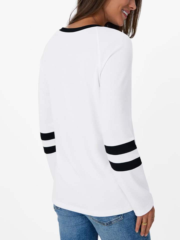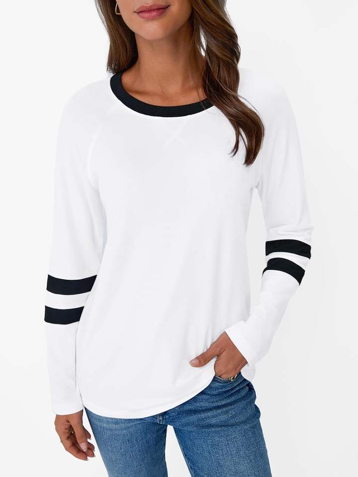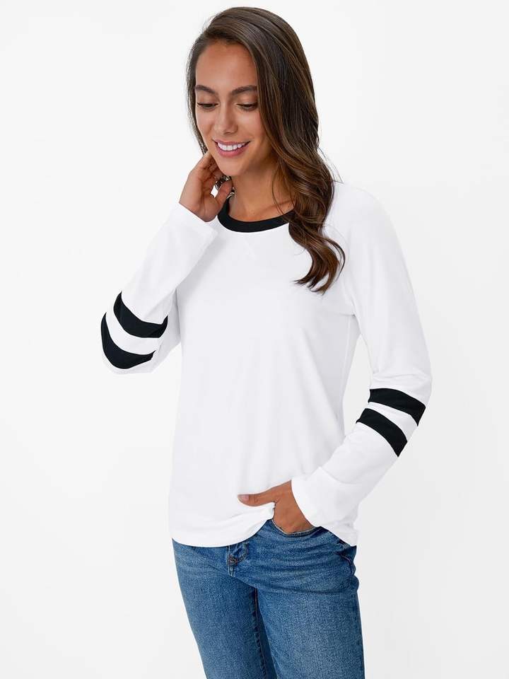 White Womens Long Sleeve Shirts Color Block Casual Crewneck Tops T-shirt Basic Tee Fall Fashion Clothes Trendy Outfits
