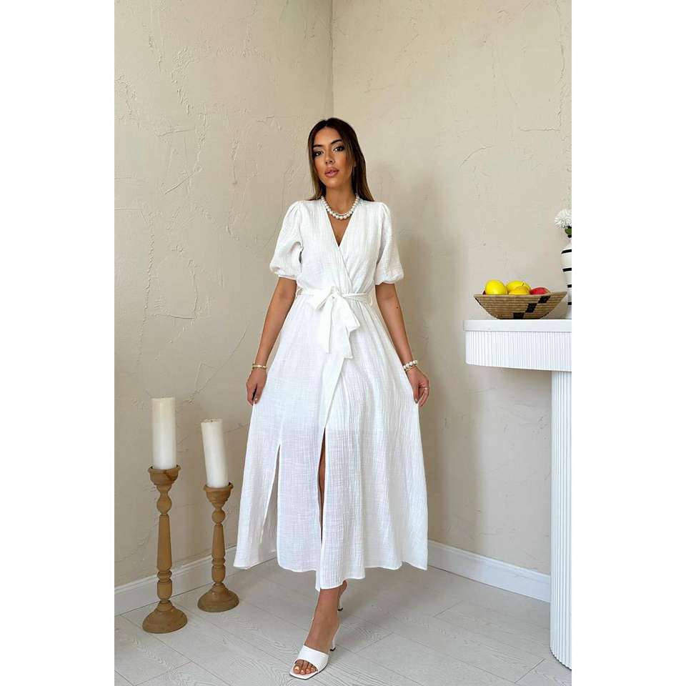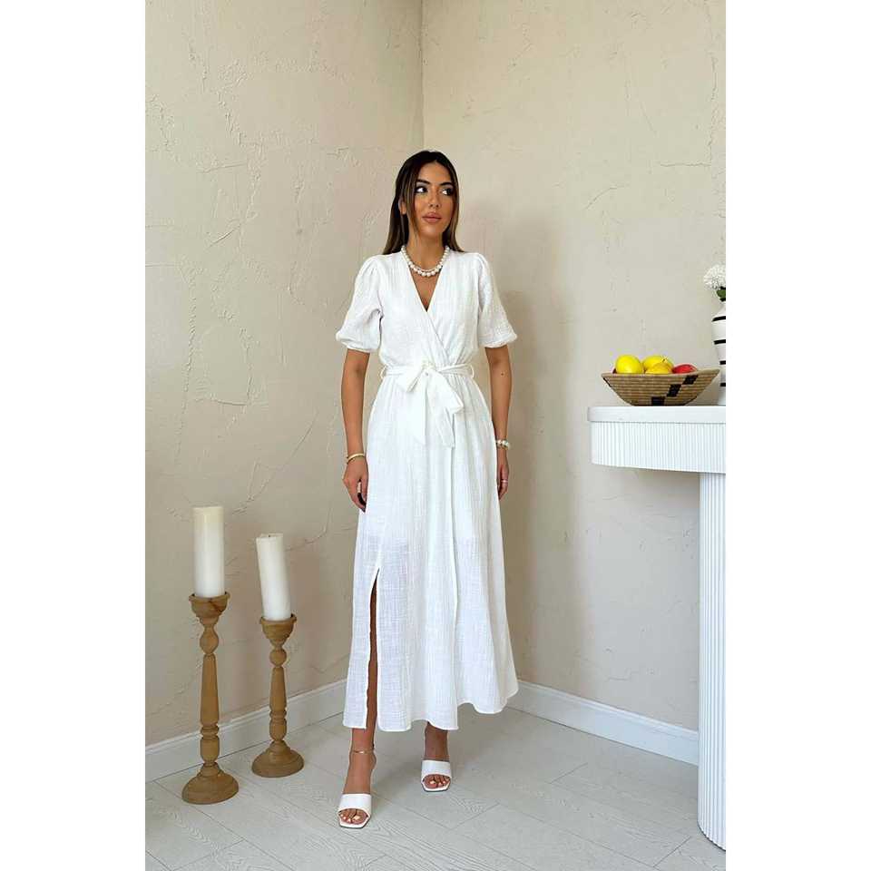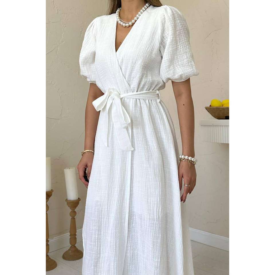 เดรสผ้าลินินสีขาว คอวี ทรงเอ ไลน์ เอวธรรมชาติ ระบายอากาศได้ดี สวมใส่สบายๆ ในชีวิตประจำวัน