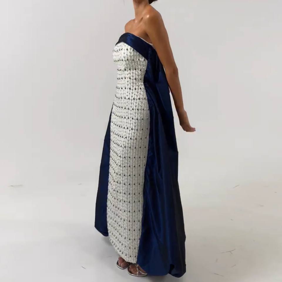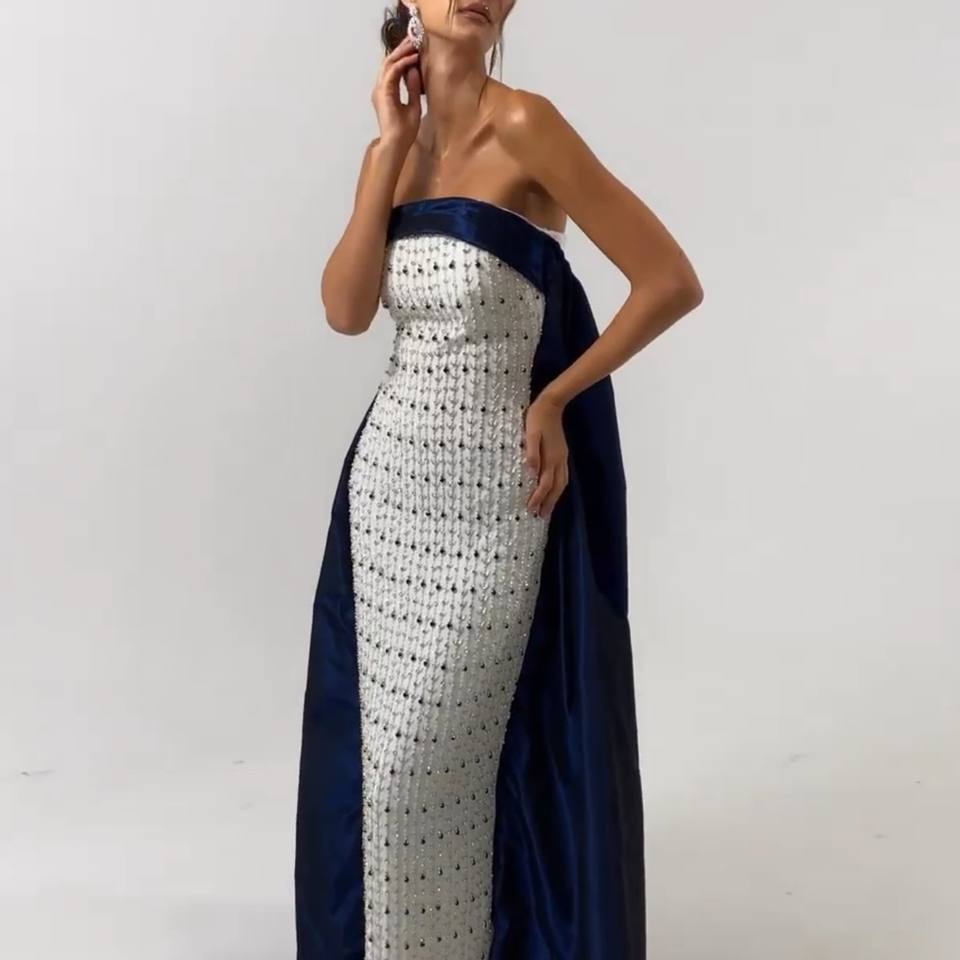 ชุดราตรีหรูหราสีขาวและสีน้ำเงินกรมท่าสำหรับผู้หญิง งานแต่งงานแบบอาหรับ ชุดออกงานอย่างเป็นทางการ ลายพิมพ์สามมิติ จับจีบ รุ่น SF159-1