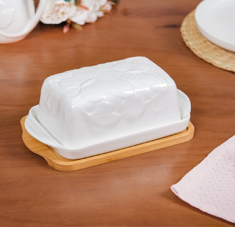 จานเนยเซรามิกสีขาวที่มีลวดลายเพชรสีเทามีจำหน่ายในราคาขายส่งจานเนยเซรามิก