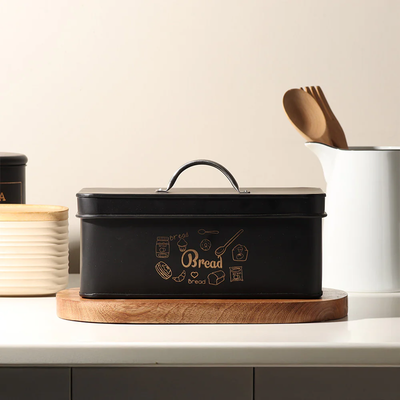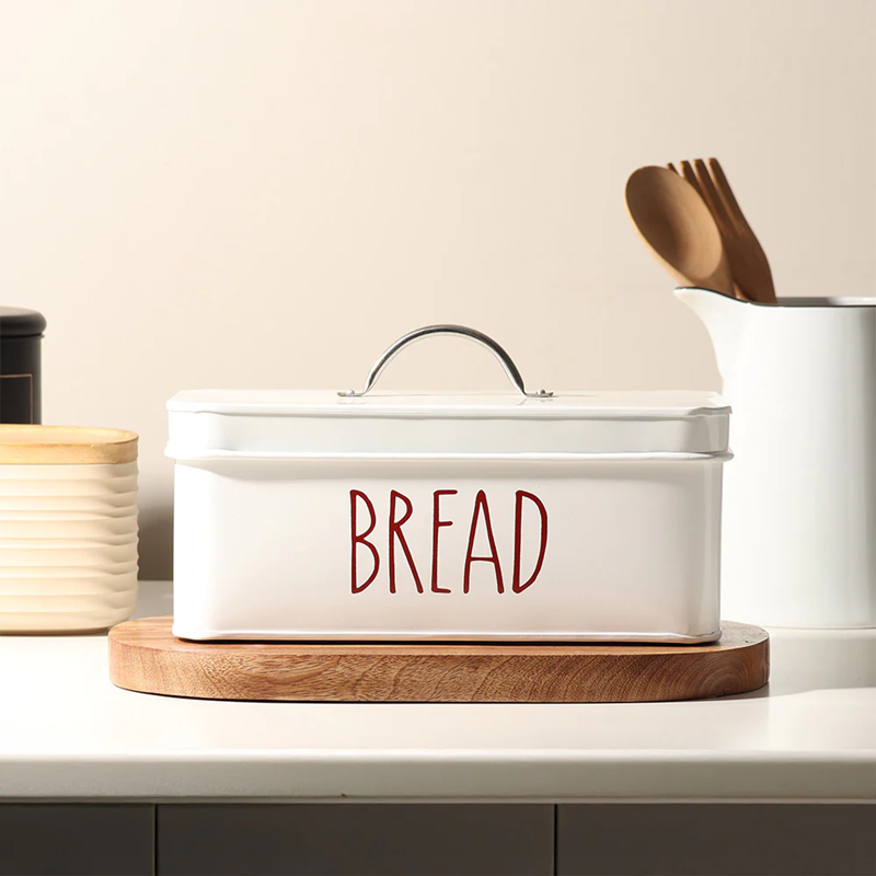กล่องขนมปังโลหะสีขาวที่มีที่จับ "ขนมปัง" ในสคริปต์สีแดงมีจำหน่ายในราคาขายส่ง