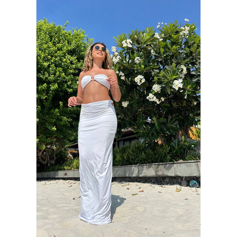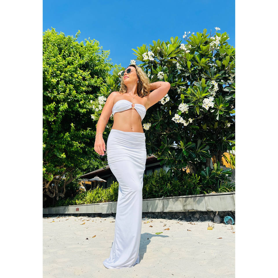 White stretch maxi skirt with gold hoop low and high rise handmade