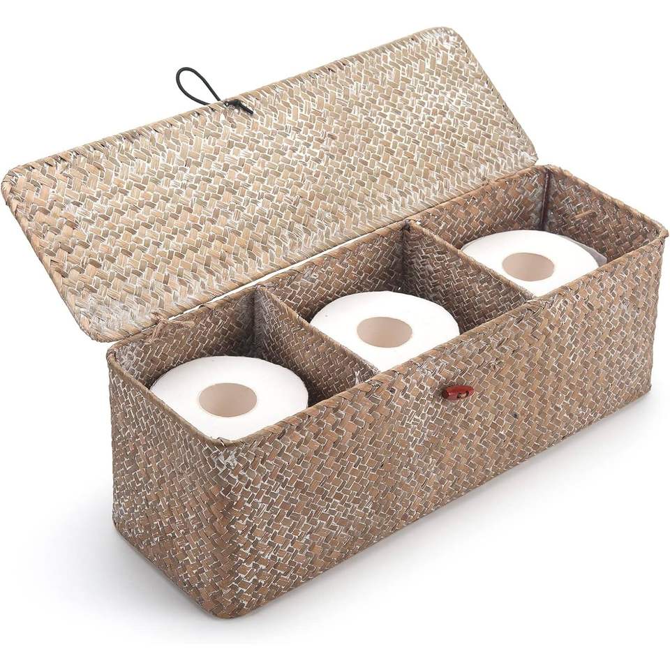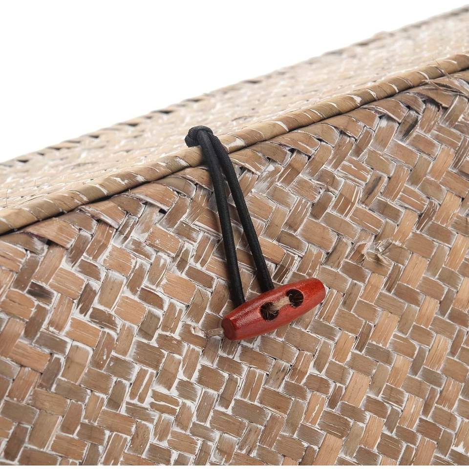 ตะกร้าฟางจากหญ้าทะเลสีขาวพร้อมฝาปิดอุปกรณ์จัดระเบียบห้องน้ำทรงสี่เหลี่ยมผืนผ้าสำหรับขนมขบเคี้ยวและของเล่นหลายส่วน