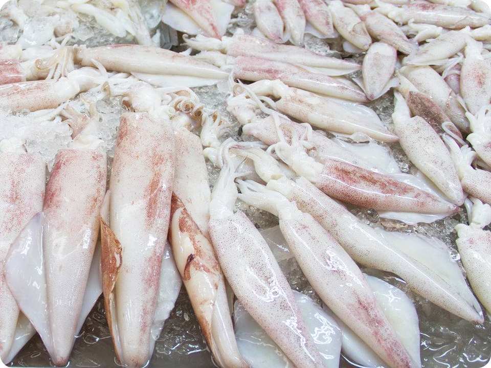 The squid parts:Squid Tube, Squid tube with skin, Squid Rings, Tentacles of Squid, The squid raw material, Breaded Squid
