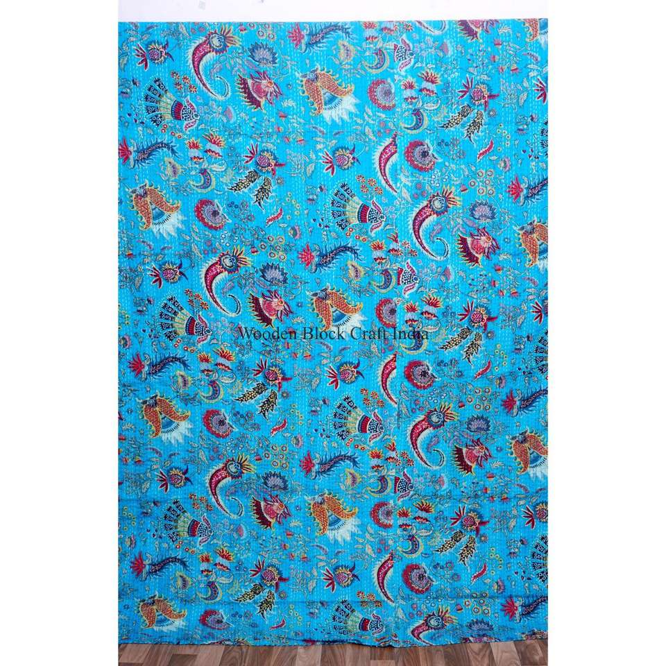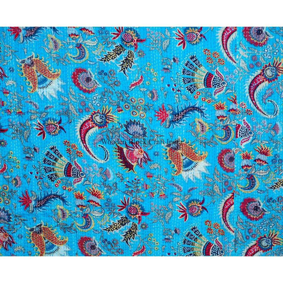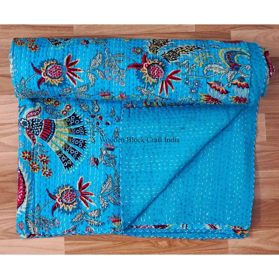 ผ้าห่มยาวทำมือลายปักแบบวินเทจ Kantha ลายดอกไม้ พิมพ์ลายสองด้าน ผ้าฝ้าย รักษ์โลก สำหรับใช้ในบ้าน
