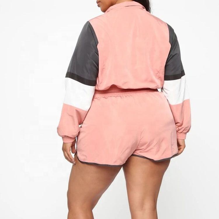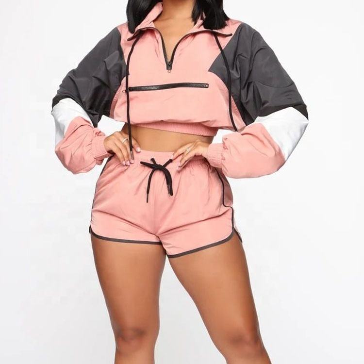 ชุดเซ็ต 2 ชิ้นสำหรับผู้หญิง เสื้อแจ็คเก็ตครอปซิปหน้าผ้าไนลอนแบบขายส่ง และกางเกงขาสั้นเอวยางยืดพร้อมเชือกผูก